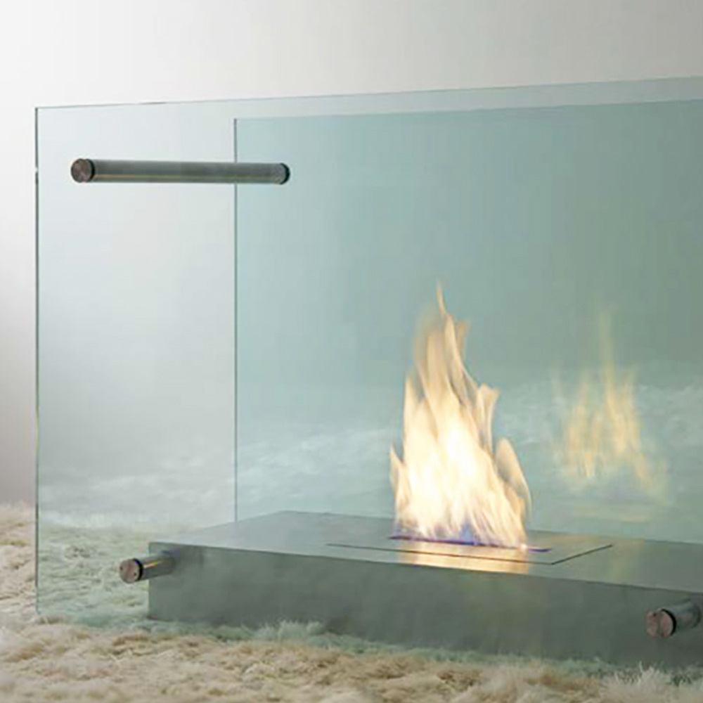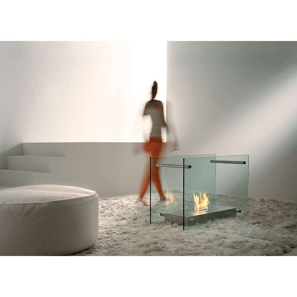 Lareira a bioetanol de piso com design moderno em aço e vidro, para interior, fabricada em Itália.