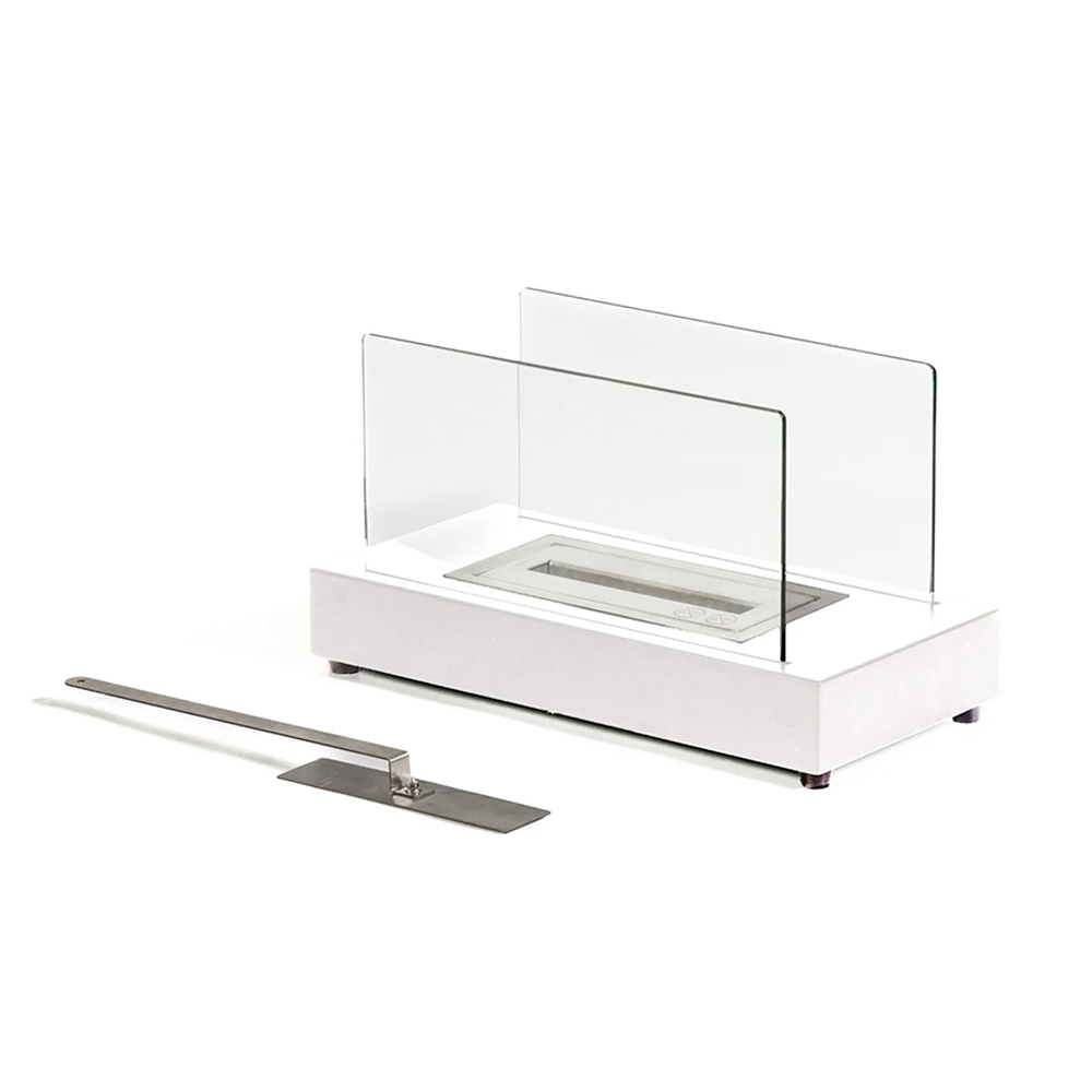 A estrutura é metálica e o vidro temperado protege a chama de possíveis rajadas de vento, destacando-a; isso também o torna adequado para ambientes externos.
