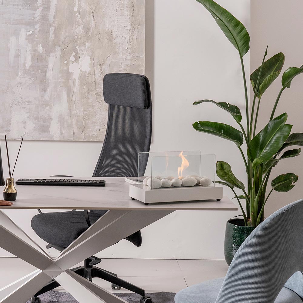 Lareira de mesa a bioetanol com design único. A prata é uma peça exclusiva que não pode faltar na sua casa.