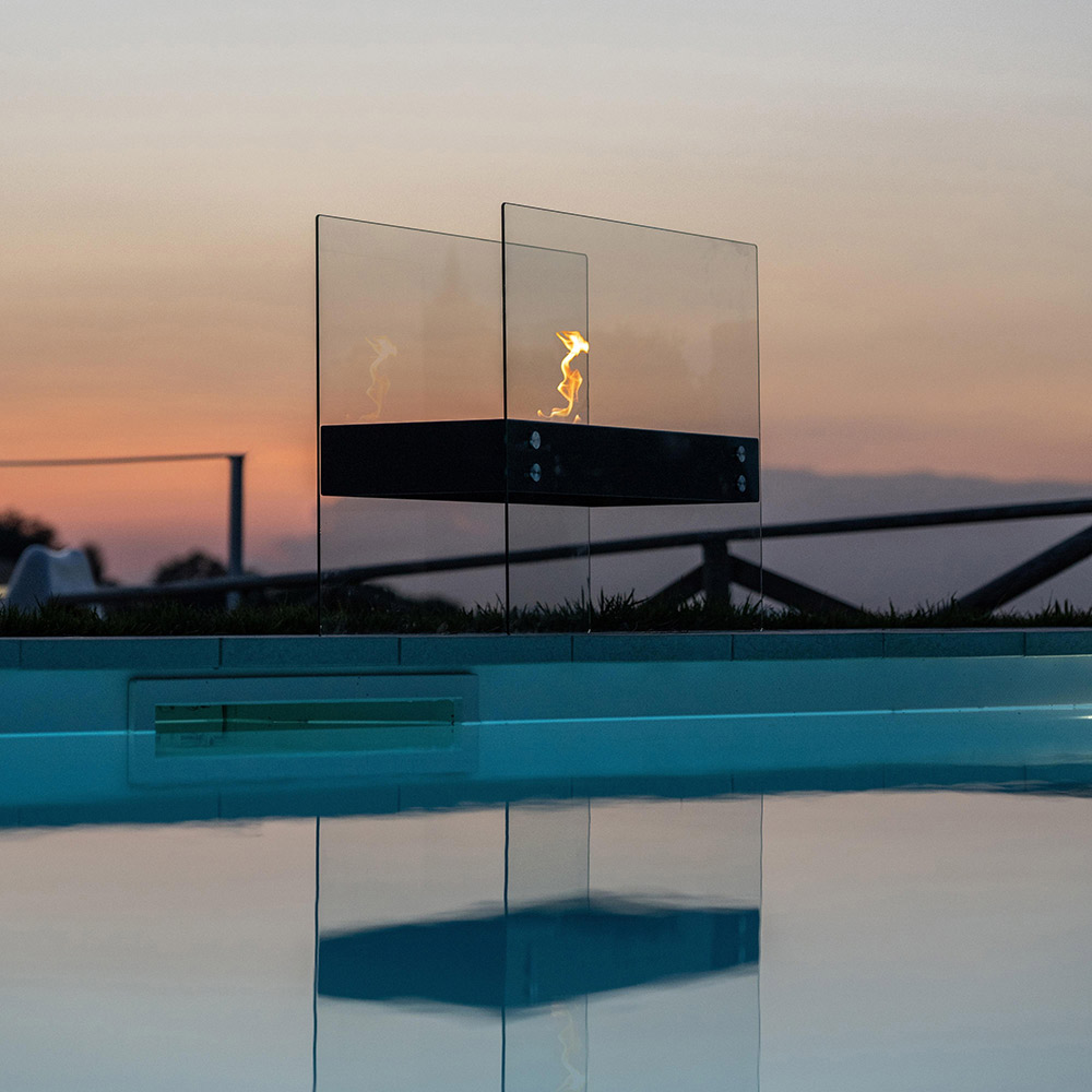 Bio-lareira de piso para uso interno ou externo feita de metal pintado de preto e vidro temperado transparente útil para proteger a chama de qualquer rajada de vento, destacando-a. Completo com ferramenta de controle de chama e manual de instruções. Um elemento de mobiliário elegante e funcional, ideal para aquecer ambientes domésticos e contratuais, tanto internos quanto externos. Sua estética minimalista e refinada o torna também apreciável quando desligado, pois completa o espaço circundante através de uma toque de estilo refinado e contemporâneo .