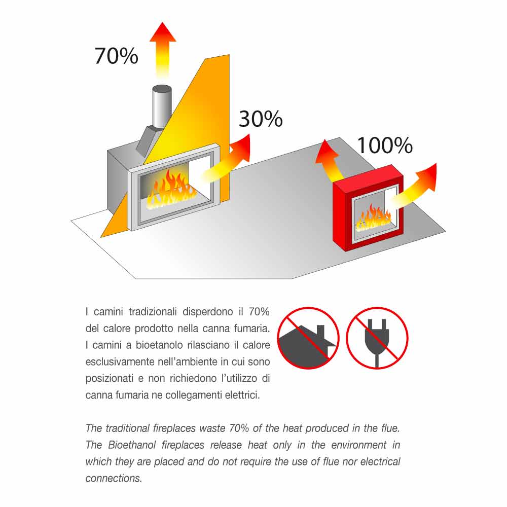 Além disso, ao contrário das lareiras tradicionais que dispersam 70% do calor produzido na chaminé, nas lareiras a bioetanol, como não há chaminé nem ligações elétricas, não há dispersão de calor, portanto a eficiência é de 100%.