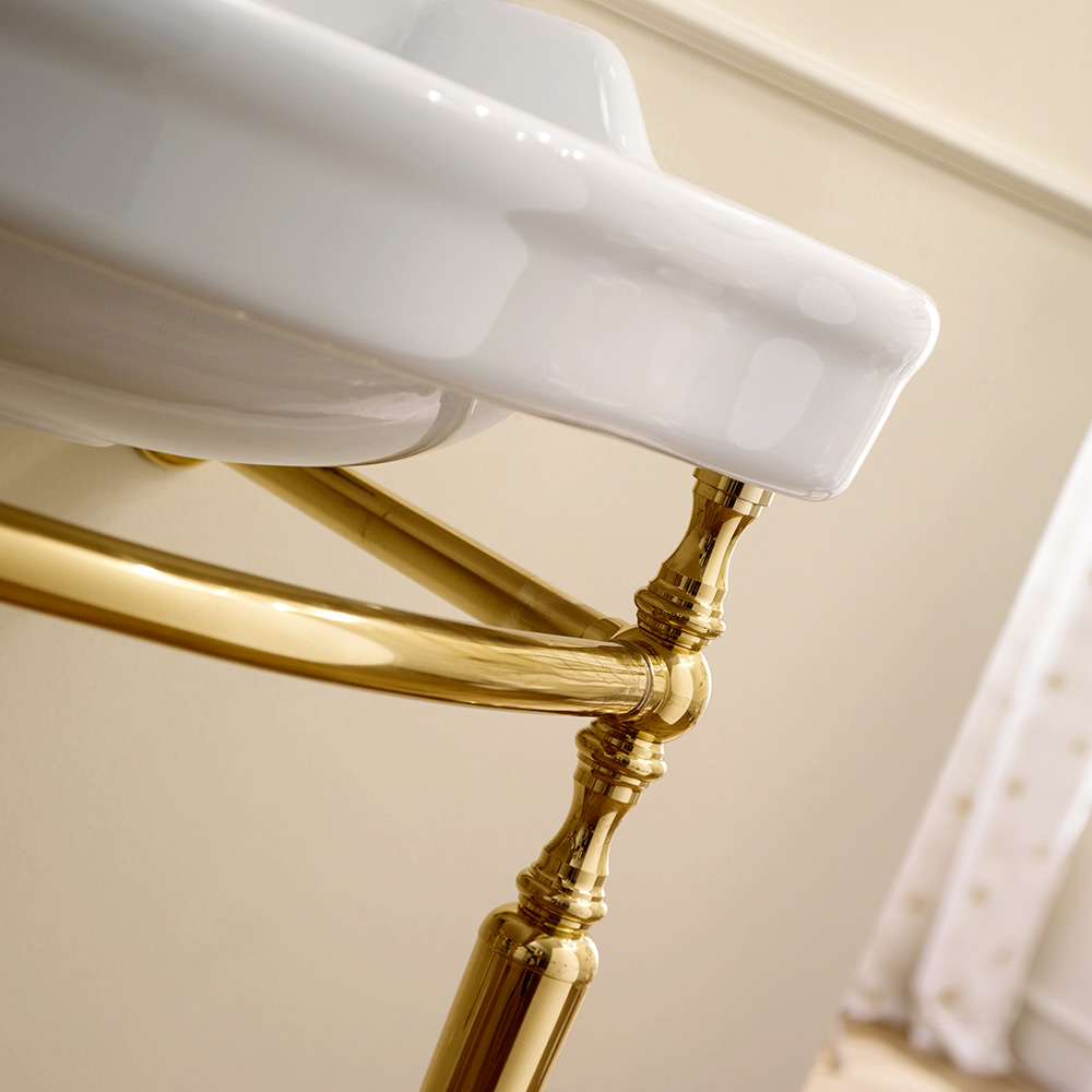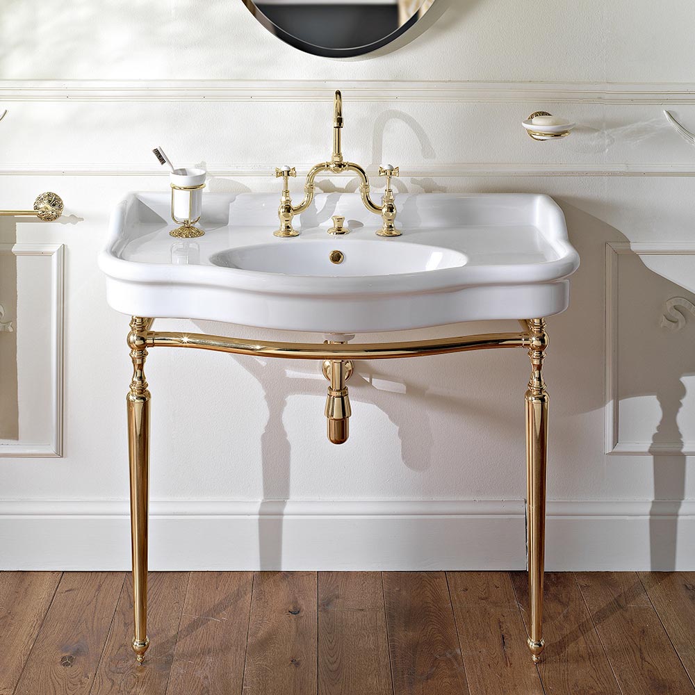 Consola de casa de banho vintage com cuba dupla em cerâmica branca e metal Paulina, fabricada em Itália.