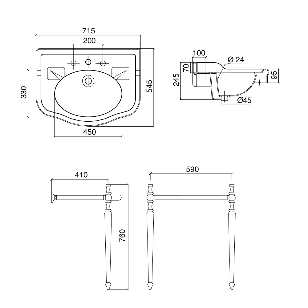 - tampo: C 71,5 x P 54,5 x A 24,5 cm base: C 59 x P 41 x A 76 cm, com contra-salpico de lavatório simples e rebordo anti-salpicos 1 ou 3 furos para torneira - C 715 mm;