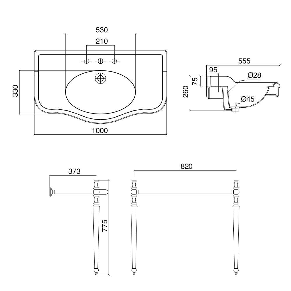 - tampo L 100 x P55,5 x A 26 cm, base L 82 x P 37 x A 77,5 cm, com lavatório simples com contra-splash e resguardo contra salpicos 1 ou 3 furos para torneira - C 1000 mm;