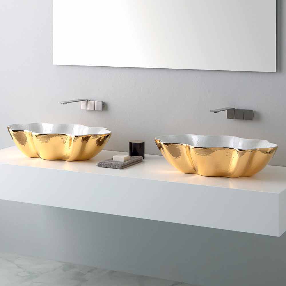 Cubo é um lavatório de bancada fabricado na Itália em cerâmica extraluxury nas duas cores ouro e branco.