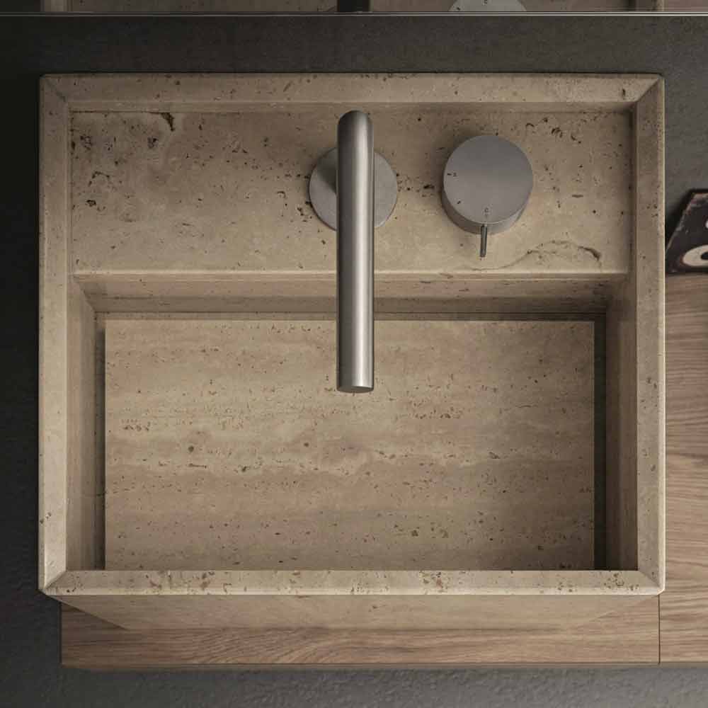 Lavatório de bancada em pedra com acabamento travertino resinoso com furo para torneira, sem furo para transbordamento, excluindo desperdícios