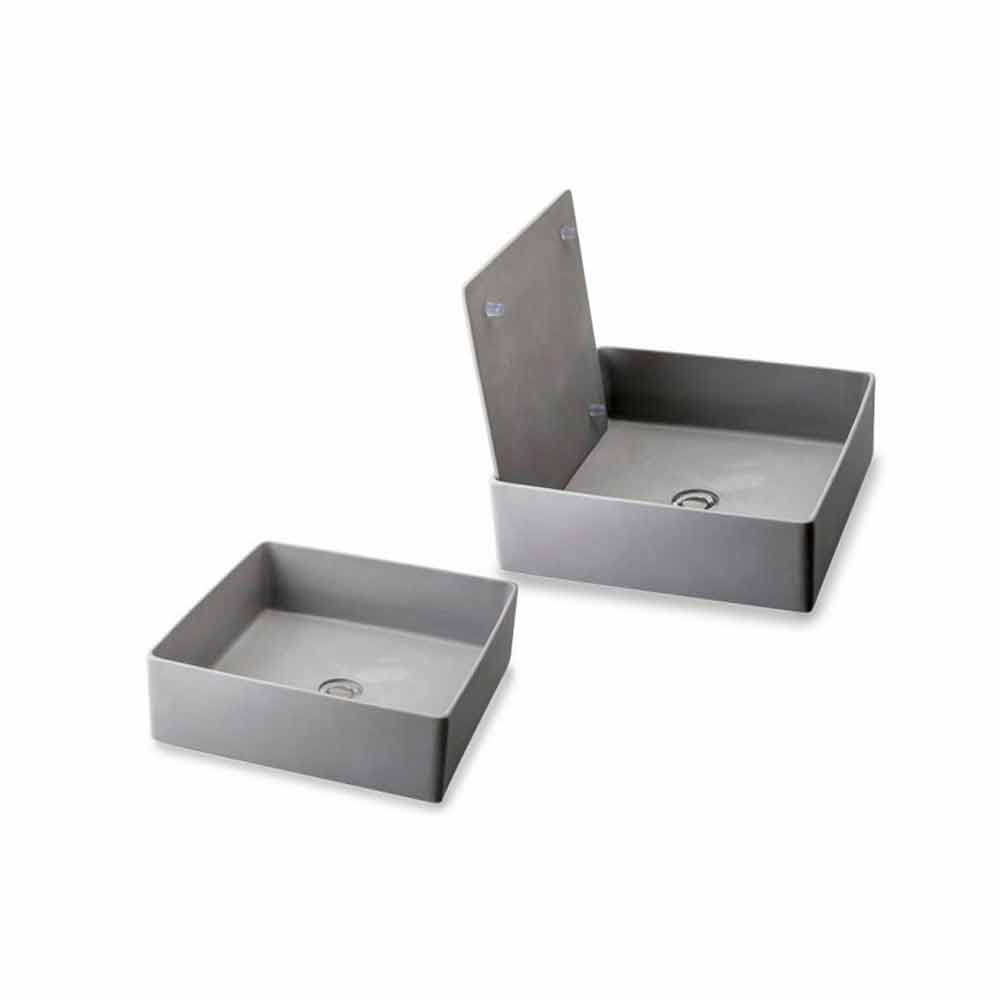 Esta pia sabe como trocar de roupa quando necessário! Esta pia de bancada em resina cinza é equipada com uma bandeja interna removível que, permitindo que a água escorra pelas bordas, cobre e esconde o ralo central. Pia de bancada em resina cinza com placa interna cobrindo o ralo central. Placa disponível em: resina, madeira e aço.