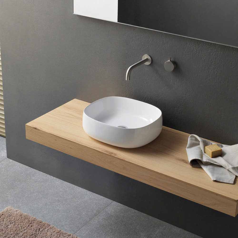 Lavatório oval e moderno de bancada, design em cerâmica branca, made in Italy.