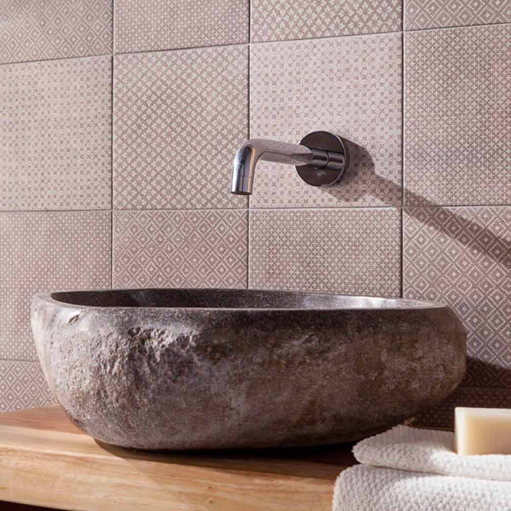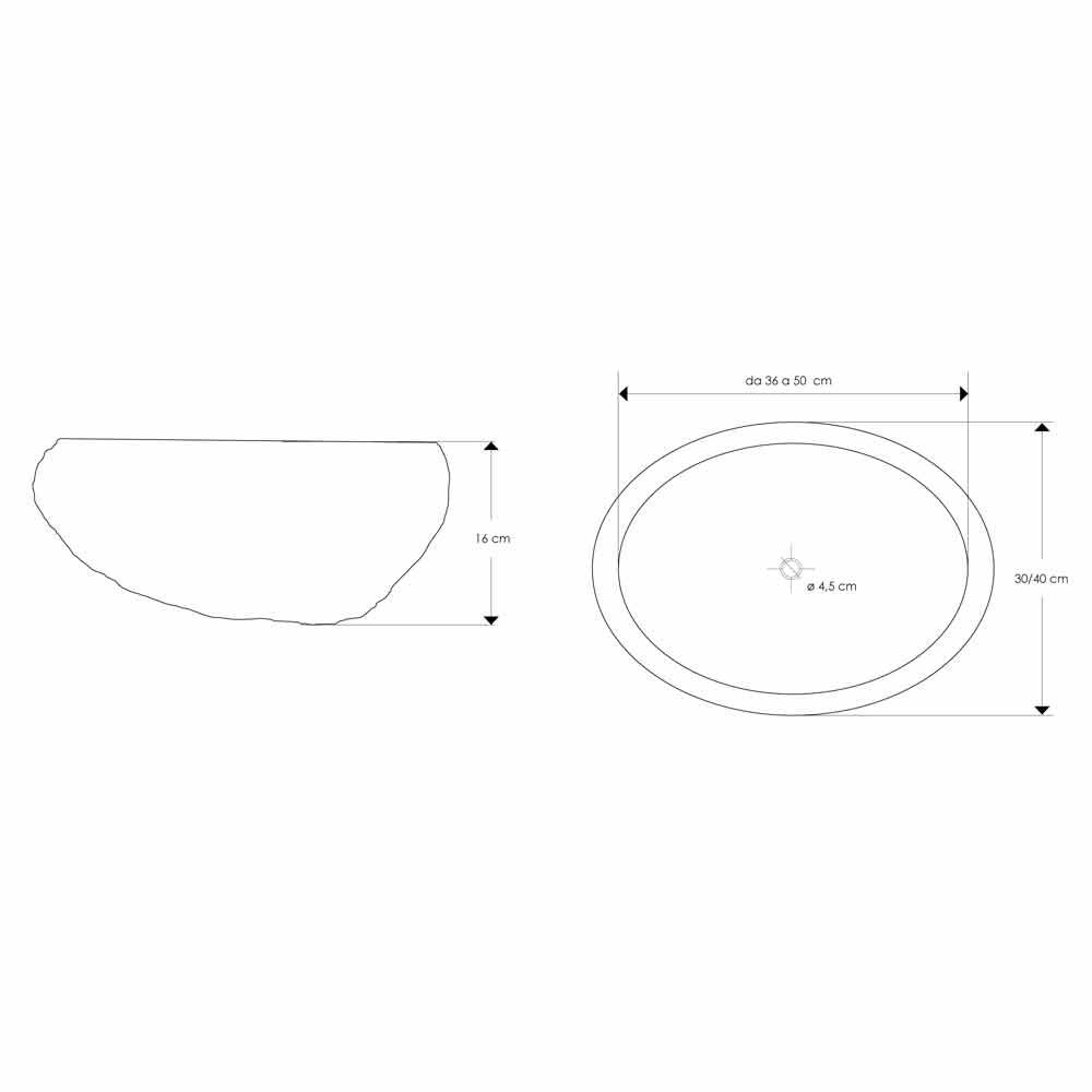 Pias de pedra do rio feitas à mão. As cores vão do cinza com tons de avelã ao antracite com reflexos âmbar. Polido internamente, é deliberadamente deixado a "natureza" externamente. Cada peça da coleção é única, a fotografada é um exemplo que não pode ser repetido em série.