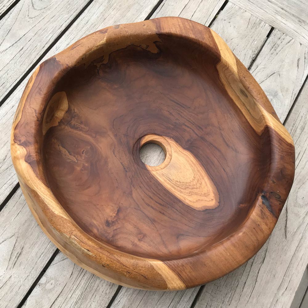 Teca natural e polida de forma essencial e prática. A madeira não tratada retorna os aromas e cores das florestas tropicais. Lavatório de bancada em teca natural lisa e sem tratamento.