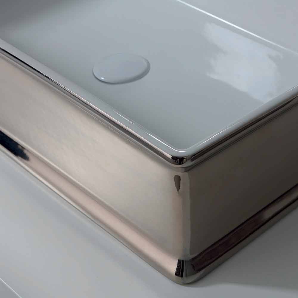 Debora é o lavatório de bancada produzido em cerâmica com acabamento branco e platina que incorpora requinte e elegância sem descurar a funcionalidade.