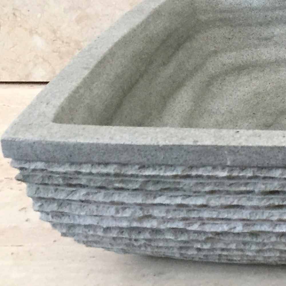 Os produtos desta linha são feitos inteiramente de pedras naturais como mármore, ônix, pedra vulcânica, pedra de rio.