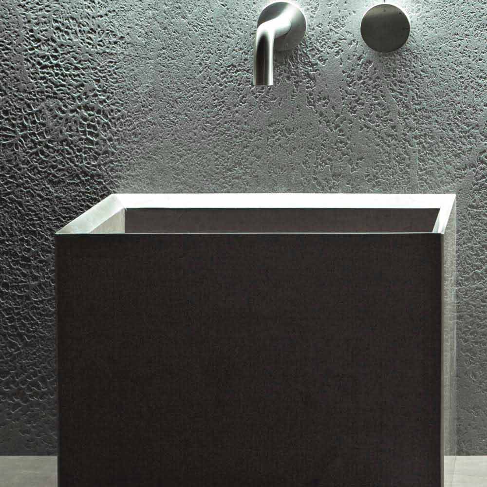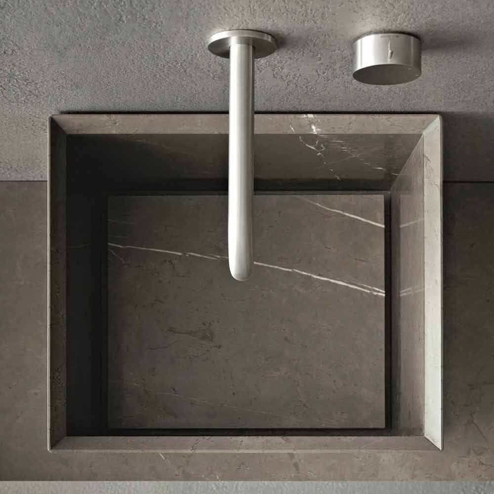 Lavatório quadrado de bancada, design moderno em pedra natural, com ralo oculto.