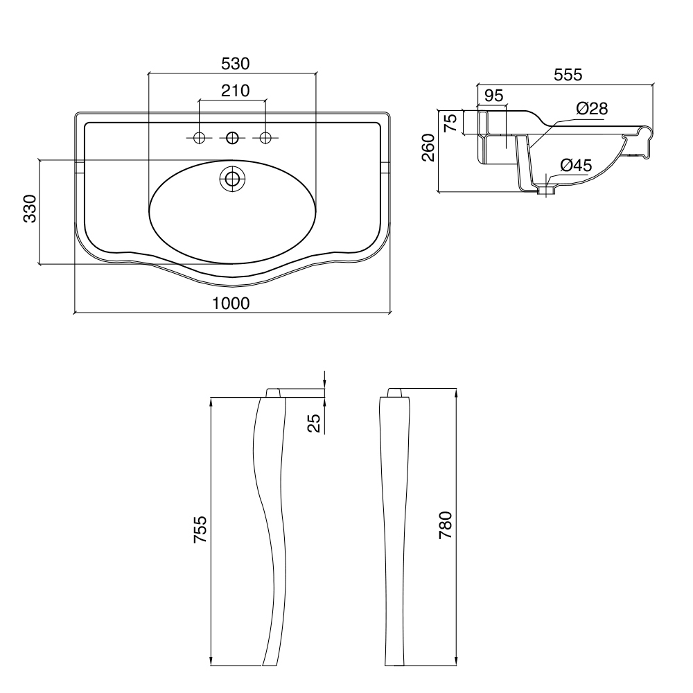 - tampo: L 100 x P 55,5 x A 26 cm com lavatório simples; pernas: A 78 cm com splashback e borda splashback 1-3 furos para torneira - L 1000 mm;