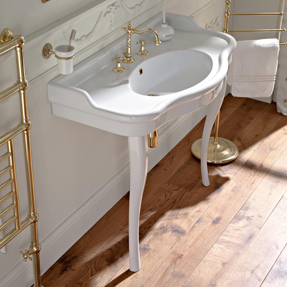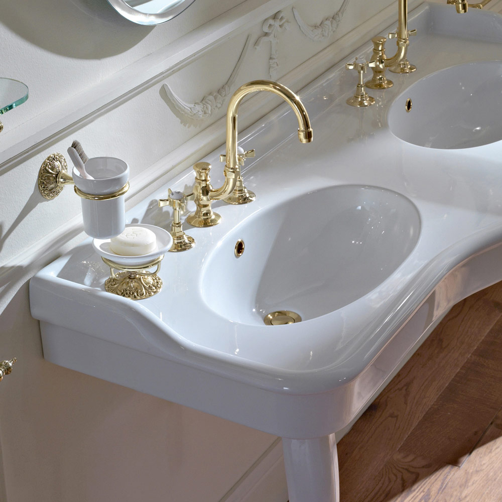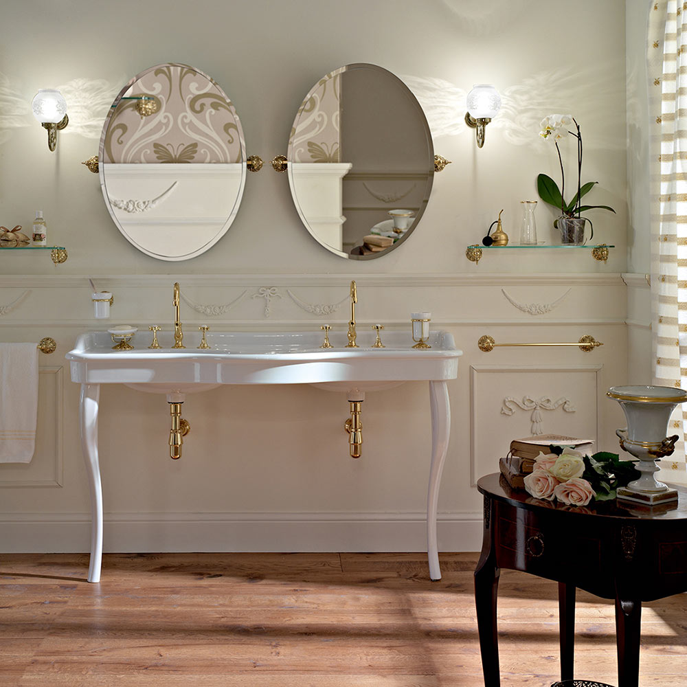 Mesa de consola de casa de banho vintage com lavatório duplo em cerâmica branca Paulina, fabricada em Itália.