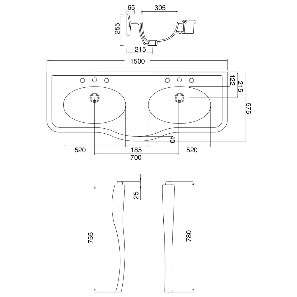 - Topo: L 150 x P 57,5 x A 25,5 cm com lavatório duplo; pernas: A 78 cm com splashback 1-3 furos de torneira para lavatório - L 1500 mm;