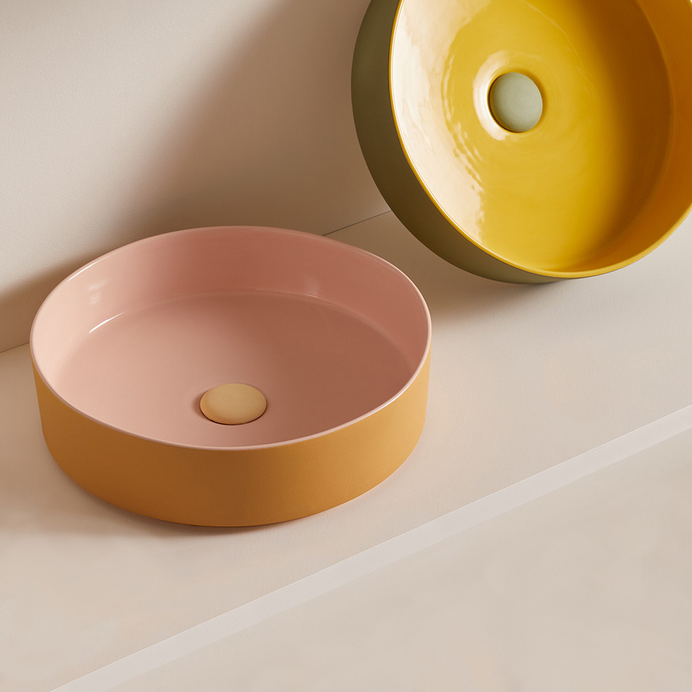Made in Italy. Este lavatório inspira-se nas cores dos doces, brincando com a
