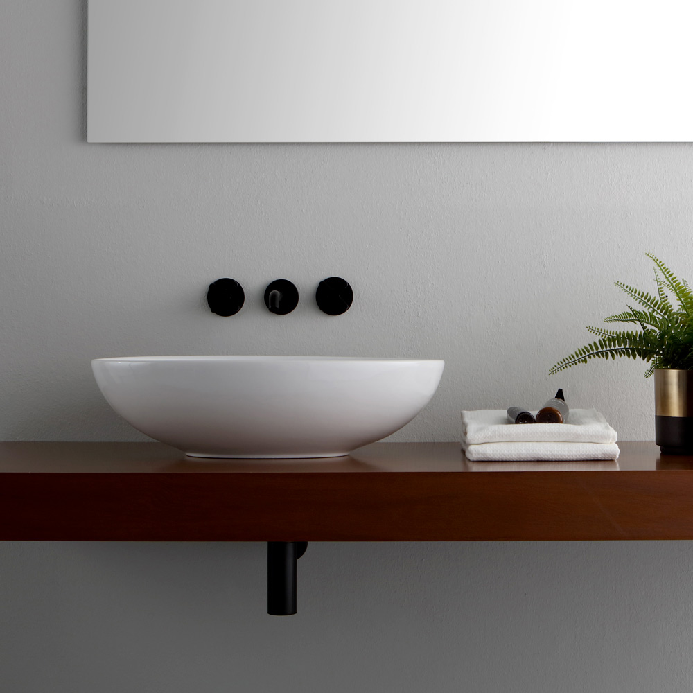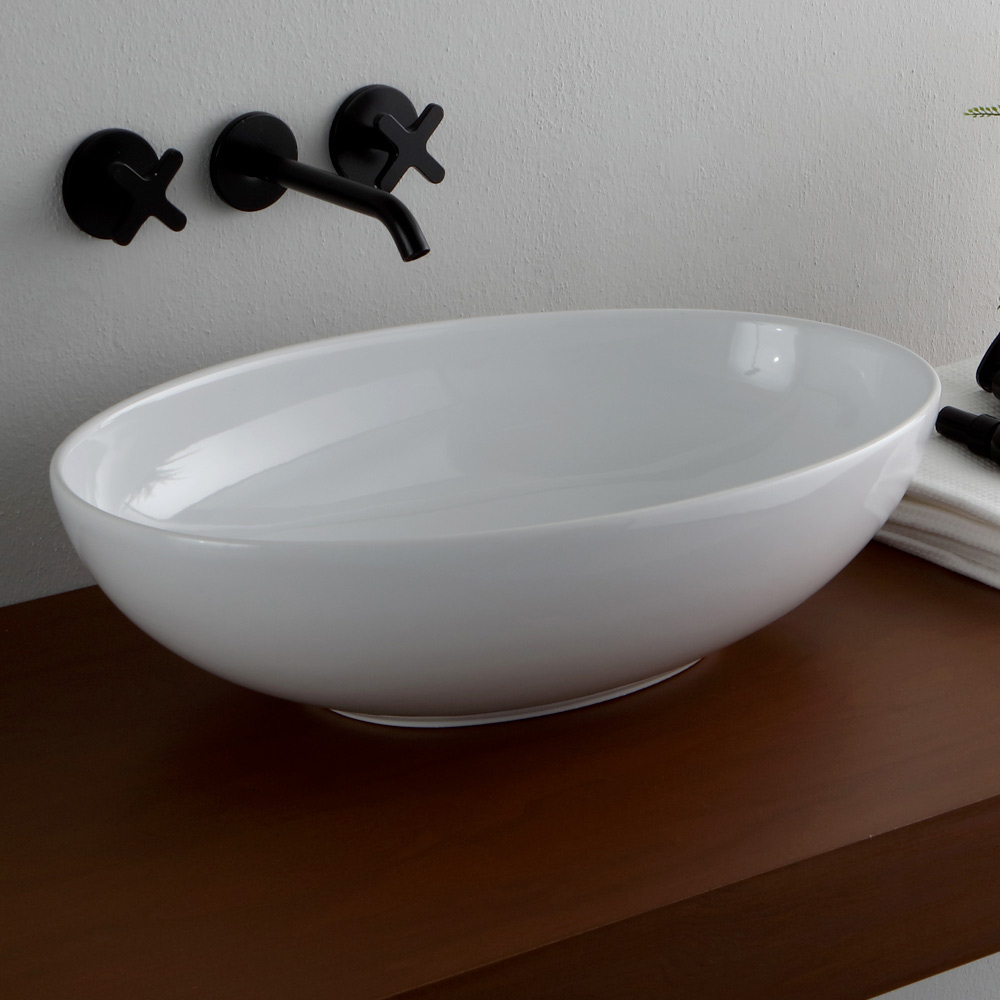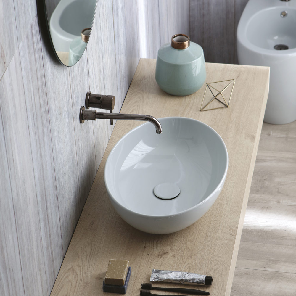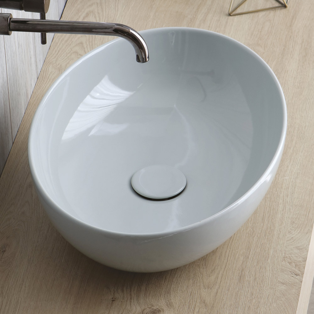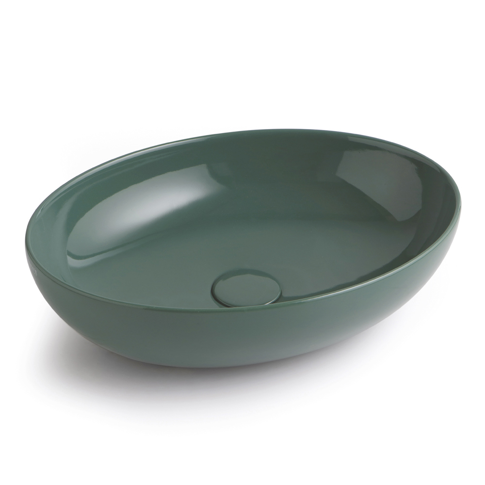 Lavatório oval de bancada em cerâmica colorida com acabamento brilhante com acabamento 100% Made in Italy . Um produto de sabor moderno e estética versátil pensado e criado para decorar as zonas de banho com um estilo minimalista onde completa o look com um toque de personalidade e carácter . O seu design simples e linhas harmoniosas adaptam-se perfeitamente a qualquer situação estilística, enriquecendo o mobiliário envolvente com um toque criativo e tornando-se assim no verdadeiro protagonista da divisão.