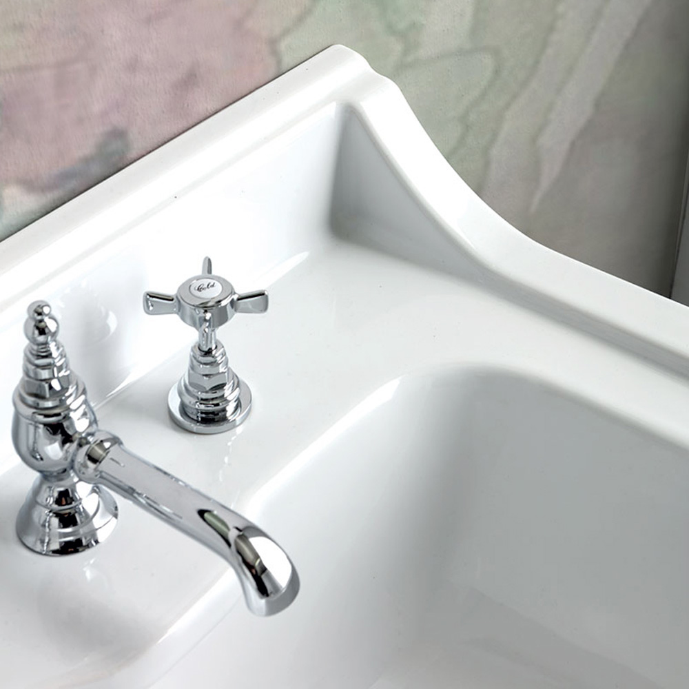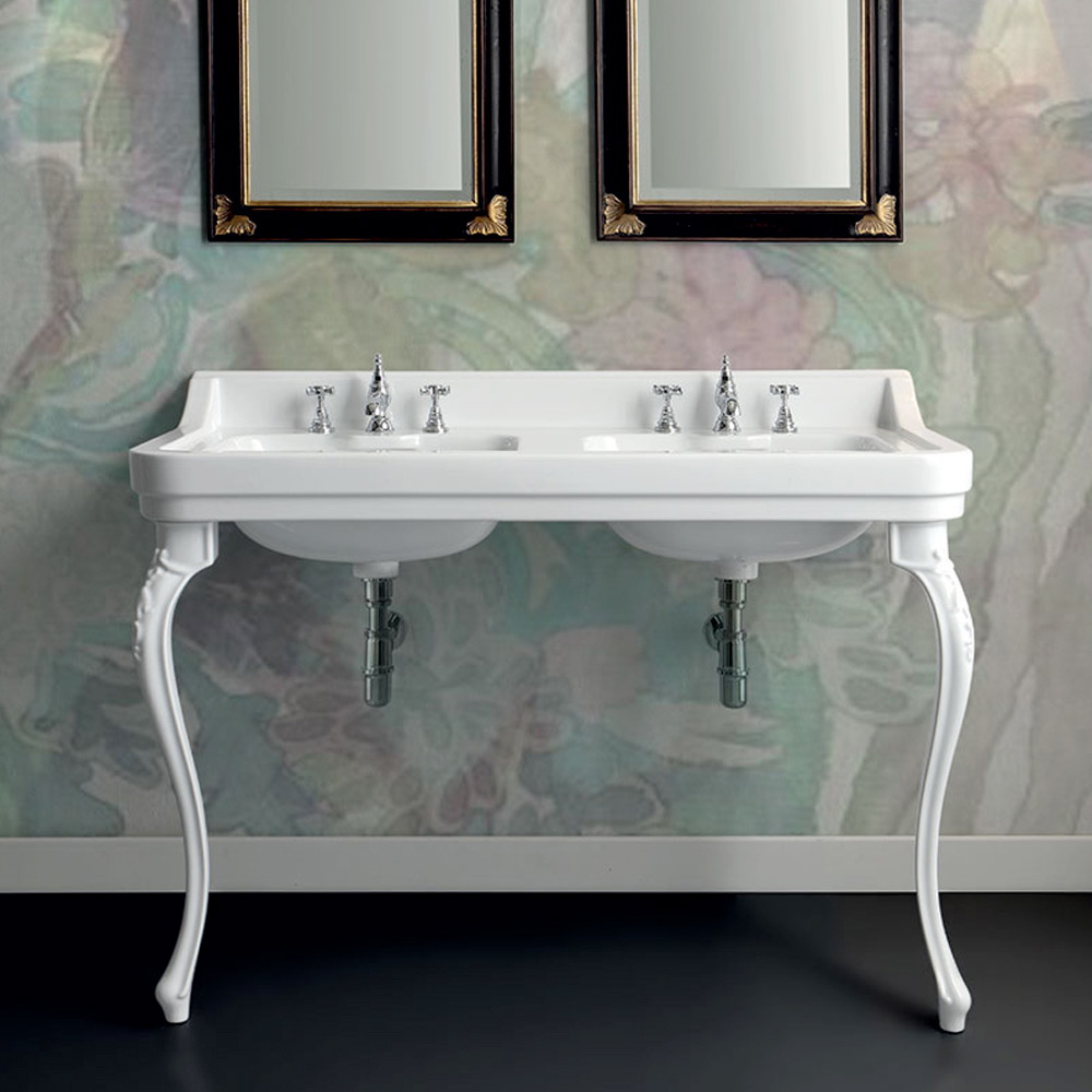 Lavatório para console com lavatório duplo em cerâmica branca brilhante de produção artesanal 100% Made in Italy . Formas clássicas e simples delineiam a delicada figura de um móvel pensado para enriquecer a área de banho através da procura atenta de elementos de forte personalidade requintada . A sua estética traz à mente um estilo do passado que se encaixa perfeitamente tanto em espaços clássicos em que cria uma maravilhosa harmonia de estilos como em ambientes com mobiliário moderno dentro dos quais constrói um contraste invulgar para um criativo e original .