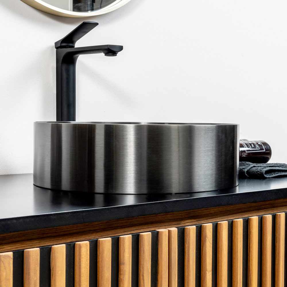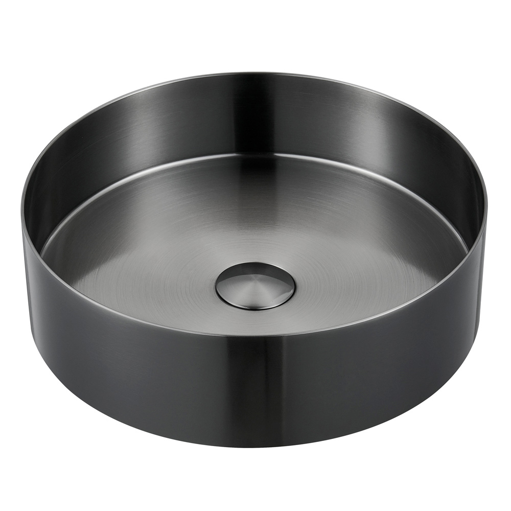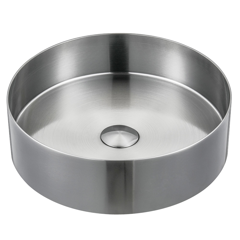 A pia redonda de bancada em aço inox SUS 304 de 3 mm é uma joia de design e funcionalidade. Fabricado a partir de uma única folha de metal, oferece uma estética limpa e moderna. O tratamento de acabamento do revestimento PVD+Nano , aliado à escovação meticulosa, confere ao objeto um aspecto atraente e quase enigmático, realçando o brilho e a resistência a manchas e arranhões. O design é caracterizado por formas equilibradas e proporções ideais, disponíveis em três acabamentos que se adaptam com elegância a qualquer ambiente. Além disso, detalhes requintados como a tampa de drenagem coordenada incluída e a total ausência de soldaduras visíveis elevam este lavatório a uma verdadeira obra-prima de artesanato e design, tornando-o numa peça de destaque para casas de banho com um toque luxuoso e contemporâneo .
