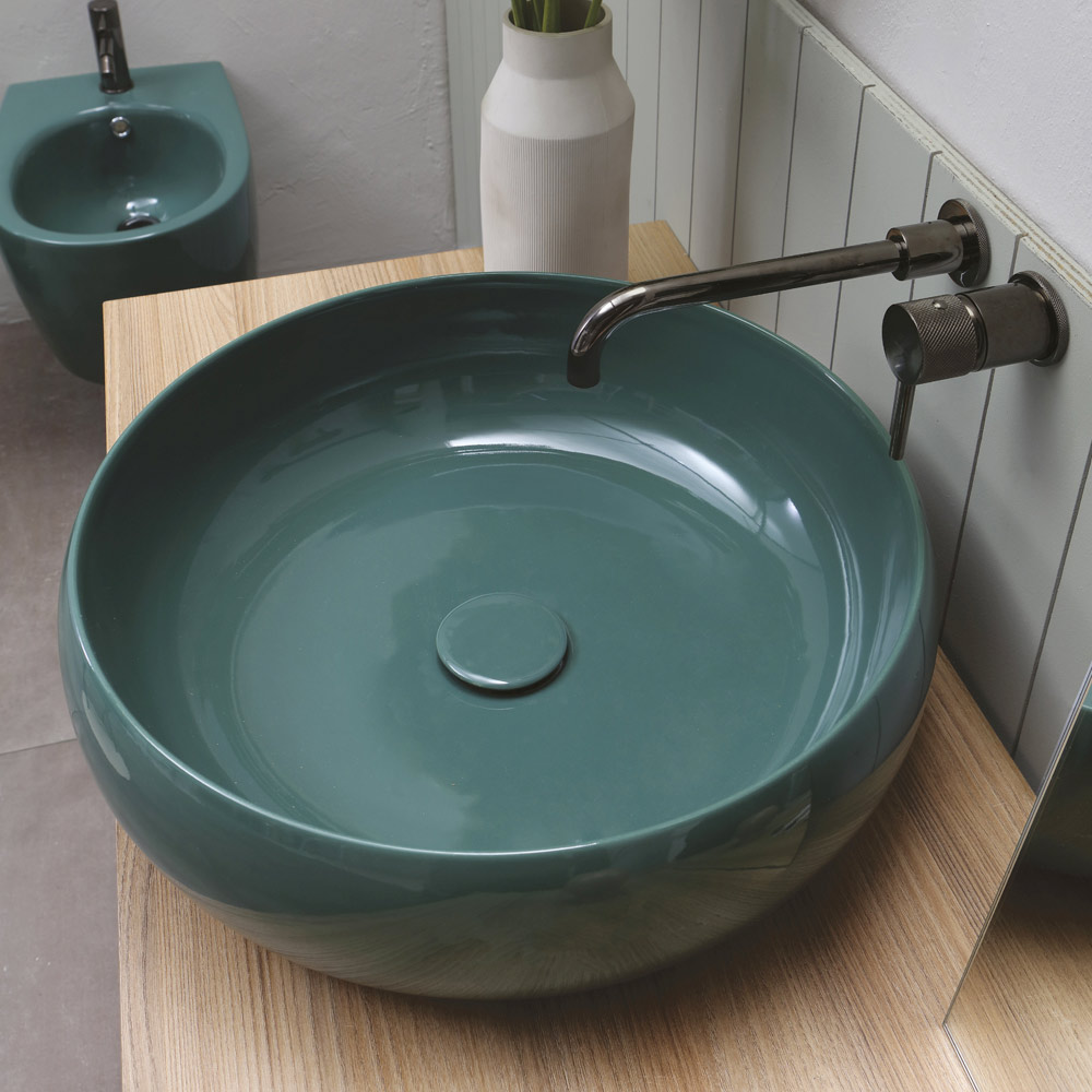 Lavatório redondo de bancada fabricado na Itália através de um artesanato em cerâmica colorida brilhante. Um móvel original e elegante que apresenta um design marcado por linhas suaves e harmoniosas que conferem ao produto toda a sua personalidade contemporânea e o seu sabor moderno . Ideal para casas de banho com mobiliário requintado e essencial, este lavatório traz consigo um forte impacto cenográfico graças às cores maravilhosas e inusitadas propostas que transformam a sua estética simples numa verdadeira obra-prima.