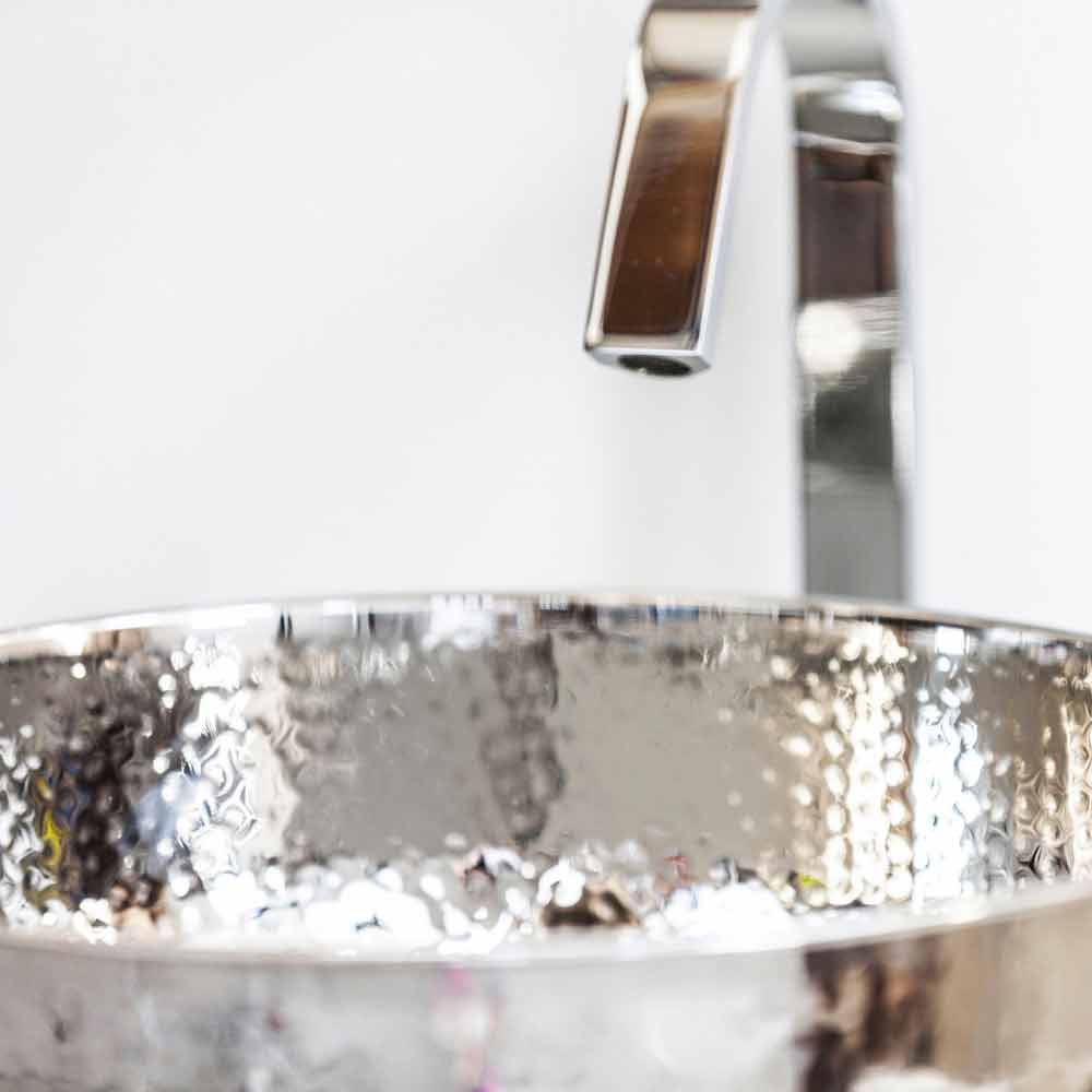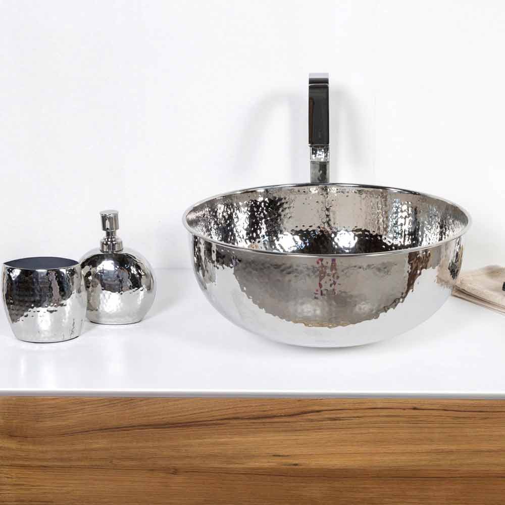 Lavatório moderno em latão cromado martelado . A borda superior ondulada confere ao lavatório mais resistência e facilidade de limpeza.