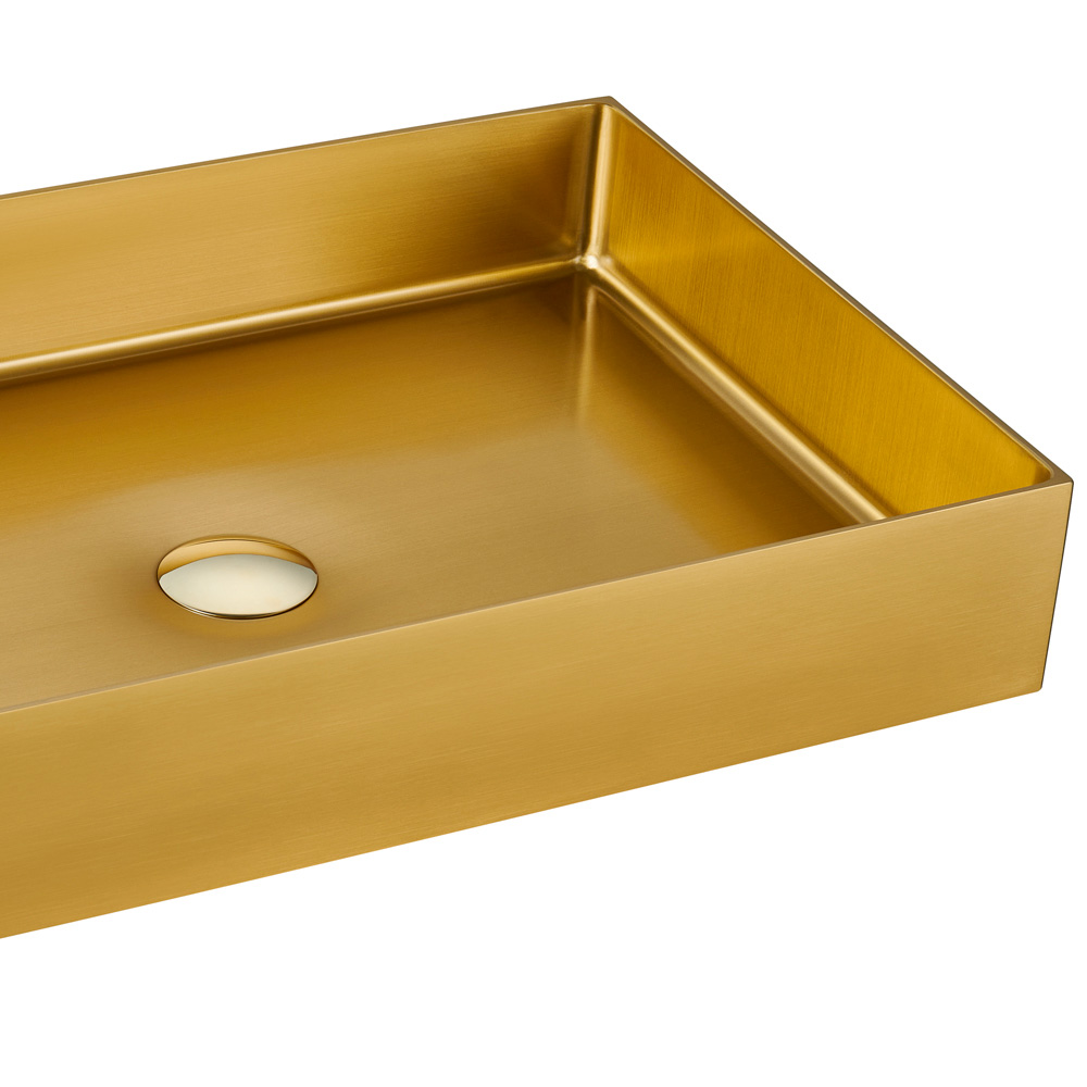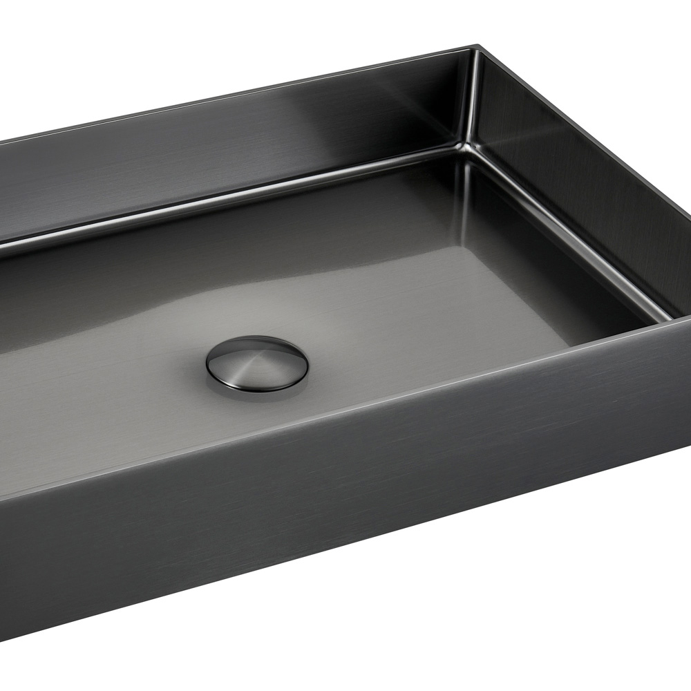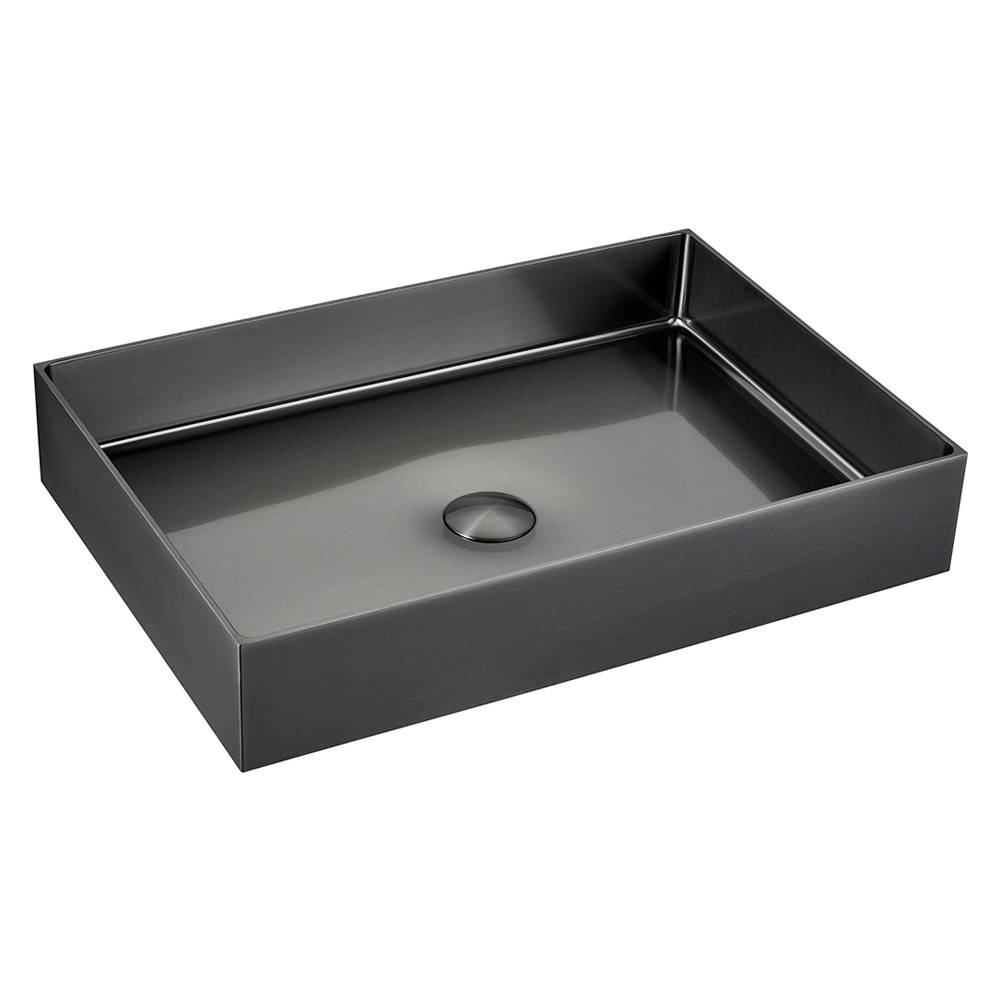 A pia de bancada retangular em aço inox SUS 304 de 3 mm é uma joia de design e funcionalidade. Fabricado a partir de uma única folha de metal, oferece uma estética limpa e moderna. O tratamento de acabamento do revestimento PVD+Nano , aliado à escovação meticulosa, confere ao objeto um aspecto atraente e quase enigmático, realçando o brilho e a resistência a manchas e arranhões. O design é caracterizado por formas equilibradas e proporções ideais, disponíveis em três acabamentos que se adaptam com elegância a qualquer ambiente. Além disso, detalhes requintados como a tampa de drenagem coordenada incluída e a total ausência de soldaduras visíveis elevam este lavatório a uma verdadeira obra-prima de artesanato e design, tornando-o numa peça de destaque para casas de banho com um toque luxuoso e contemporâneo .