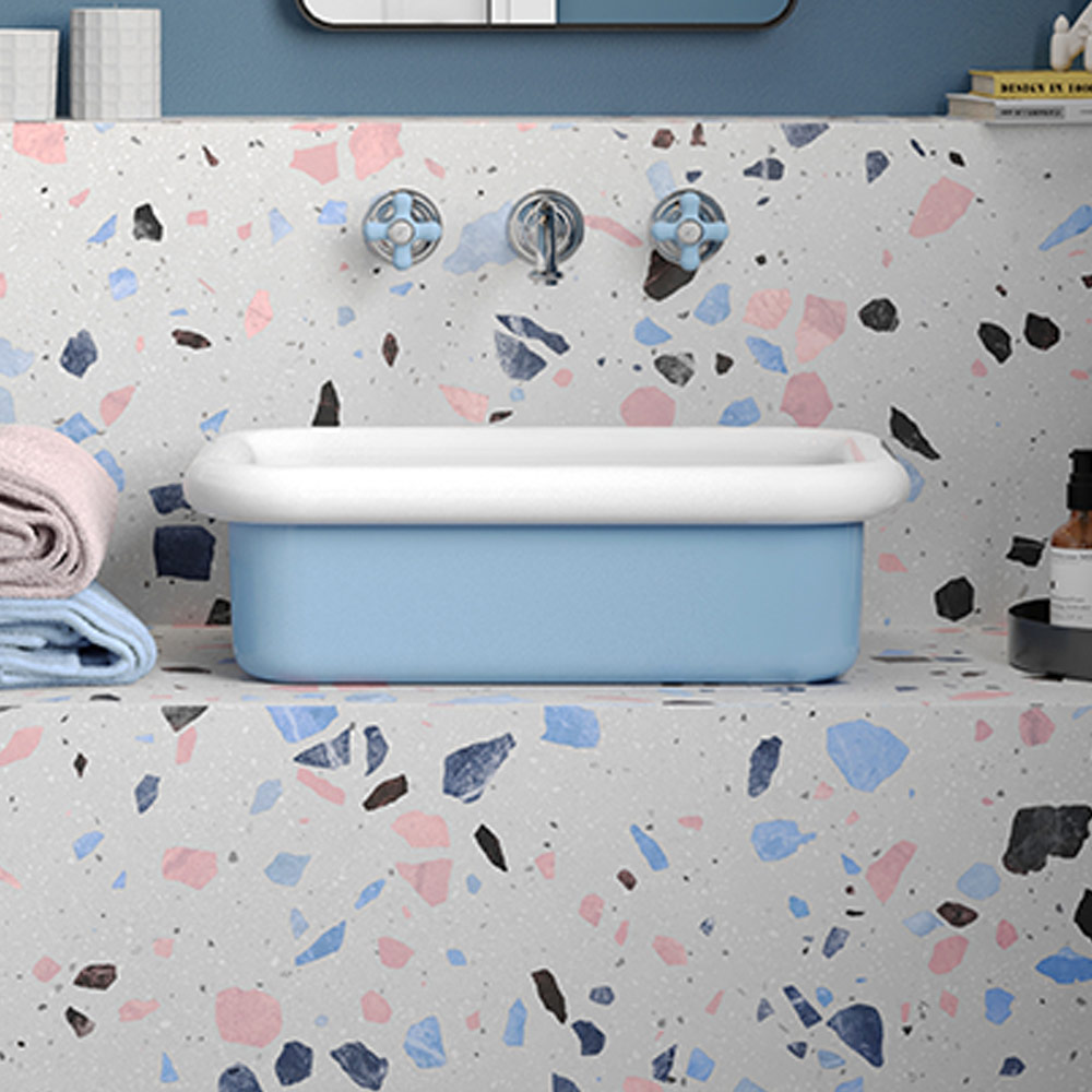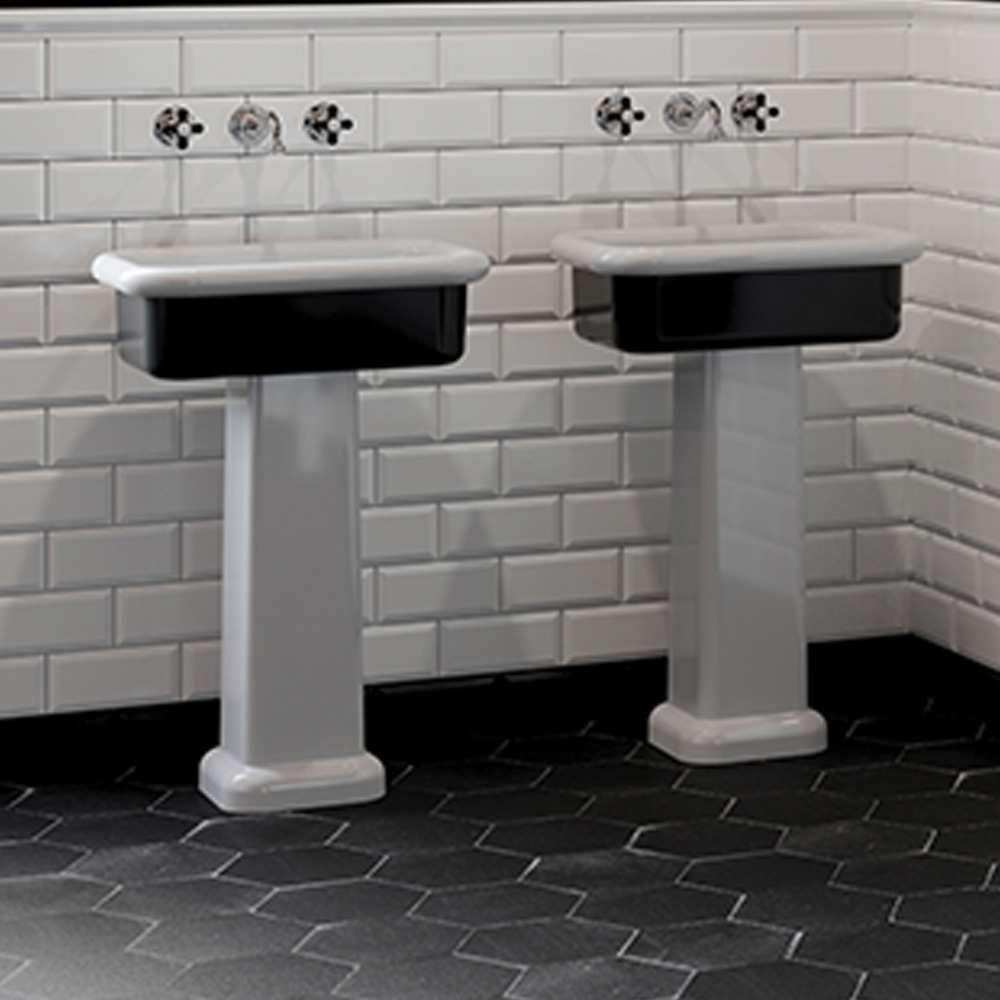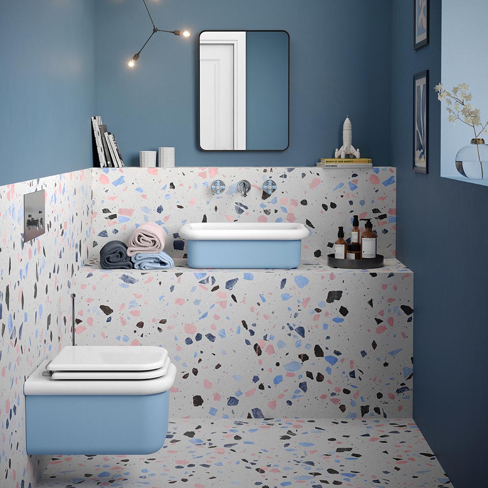 cerâmica bicolor, branco ou azul pastel ou preto mate.