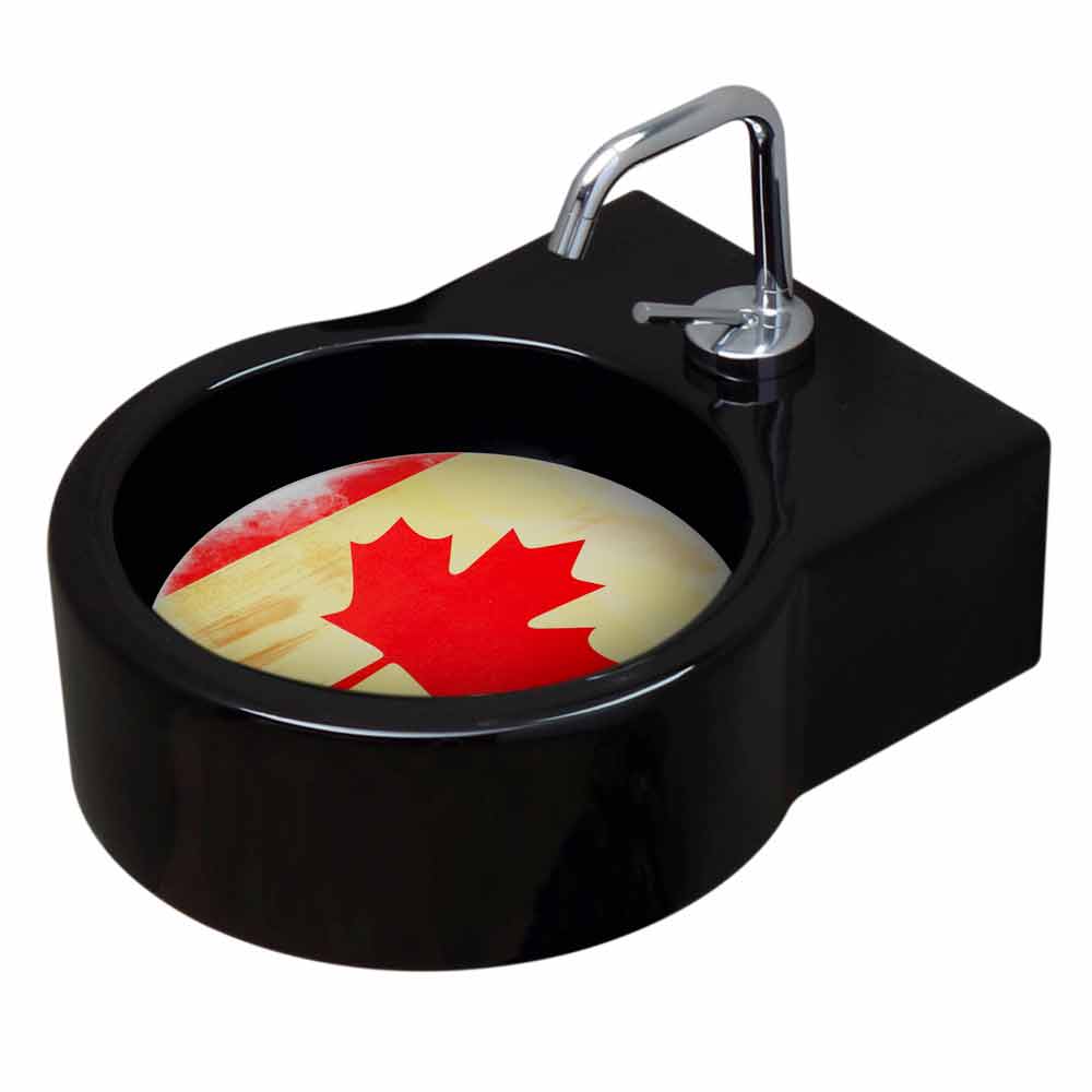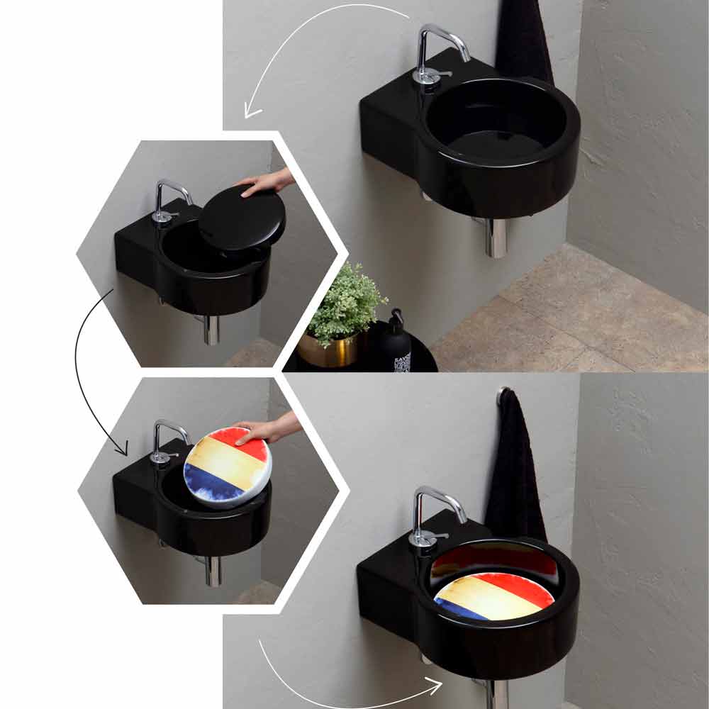 A peculiaridade é que se trata de um lavatório de mãos com fluxo contínuo de água, podendo ser instalado como suporte ou suspenso.