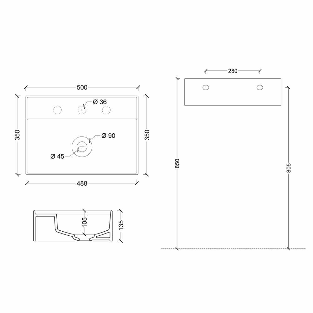 NB: Dreno cerâmico de descarga livre incluído, torneira excluída.