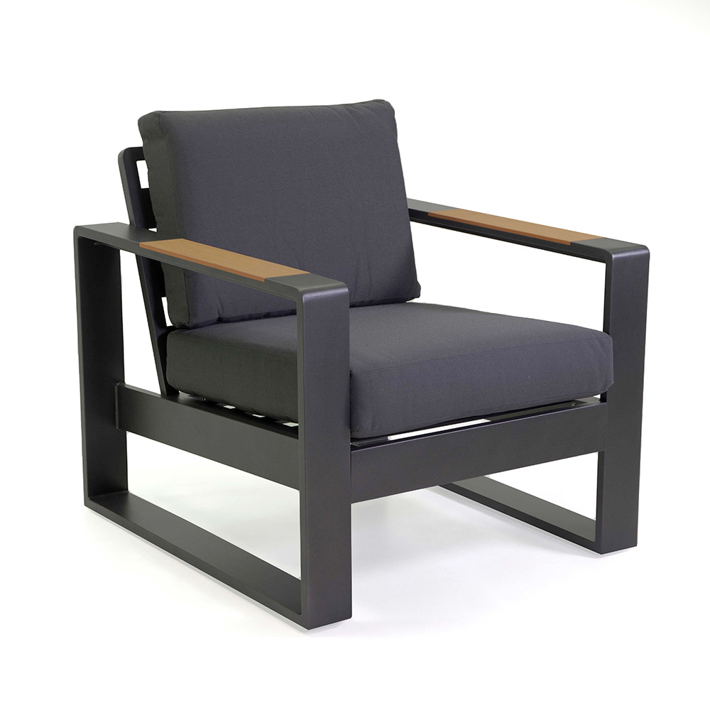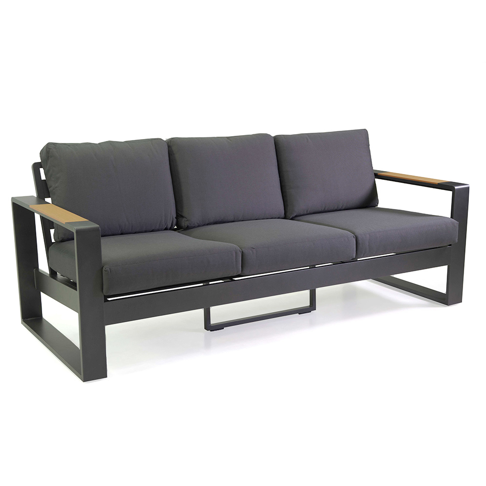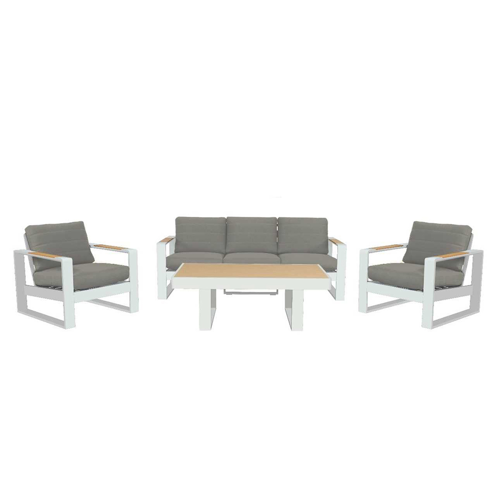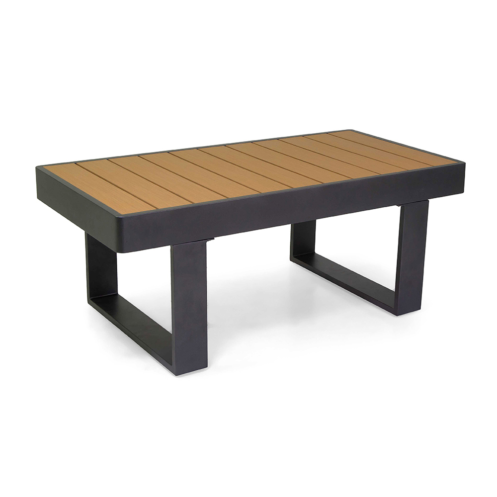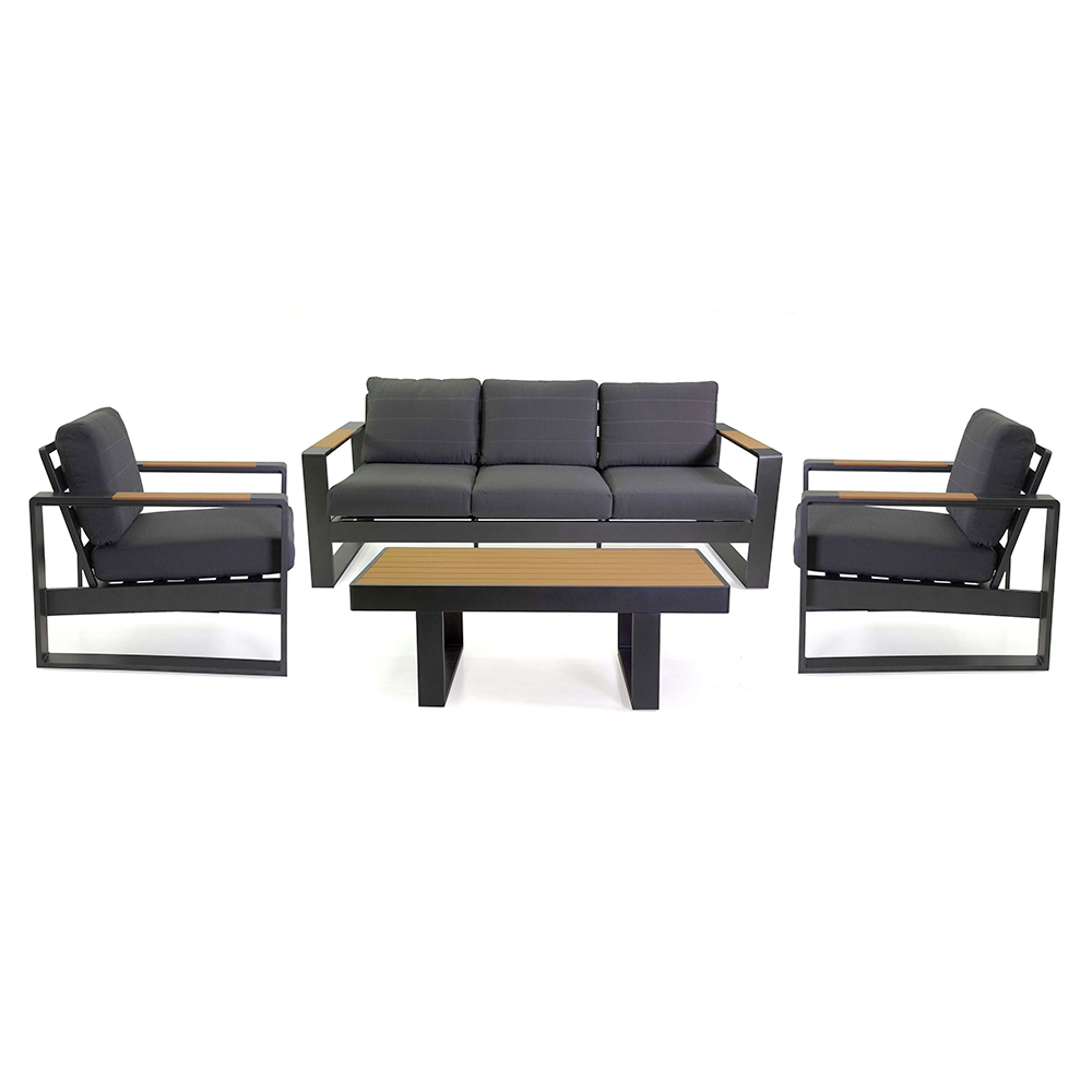 Os apoios de braços de madeira adicionam um toque de calor natural que contrasta lindamente com a estrutura, criando uma atmosfera convidativa para relaxar ou entreter. A mesa de café correspondente é perfeita para manter bebidas e lanches à mão, tornando este conjunto uma excelente escolha para qualquer pátio ou jardim.