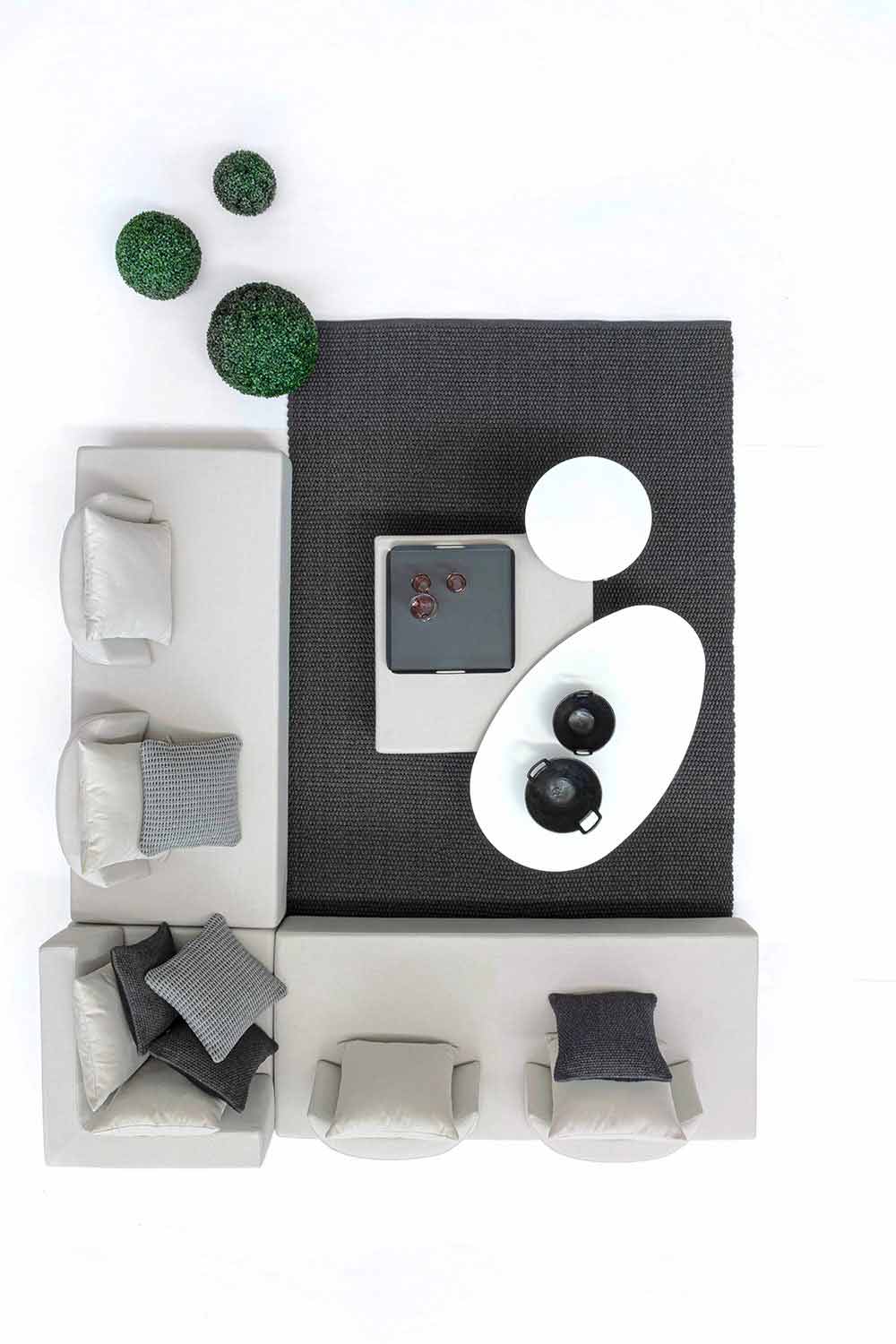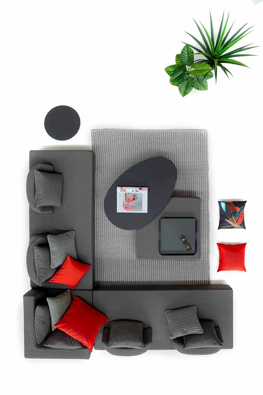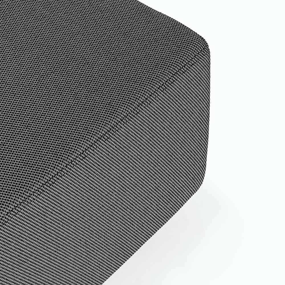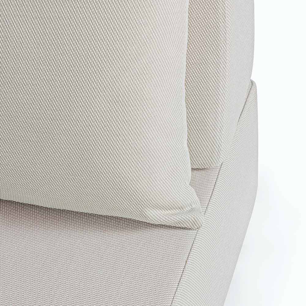 Assentos, encostos e almofadas com capa removível em tecido de olefina para uso externo (100% polipropileno, 285g / m2), repelente à água e resistente a raios UV (nota 7), impermeabilizado internamente com revestimento de tecido (poliuretano). Assento de enchimento de espuma de poliuretano (38kg / m3), encosto (20kg / m3).