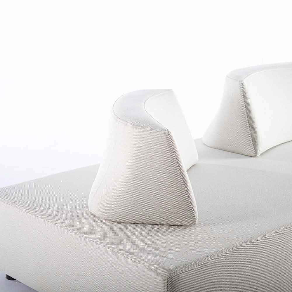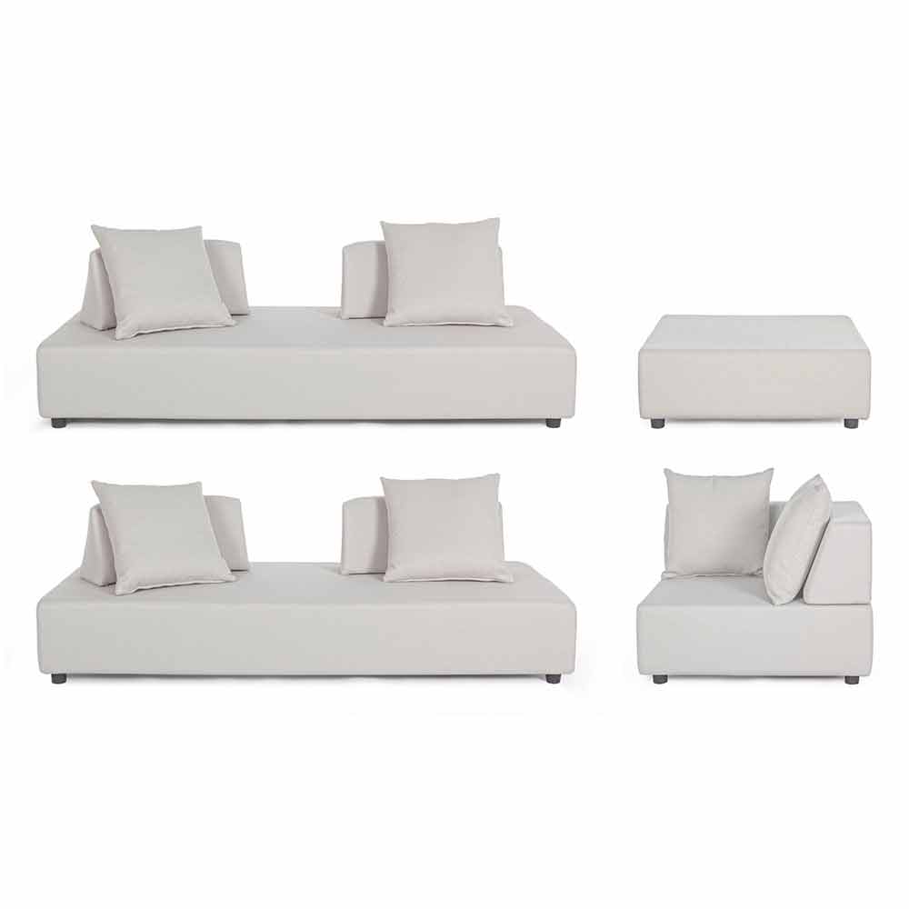 Composição de sofás e pufe com estrutura de alumínio; costas removíveis com estrutura de aço, galvanizadas a quente e pintadas a pó (poliéster).