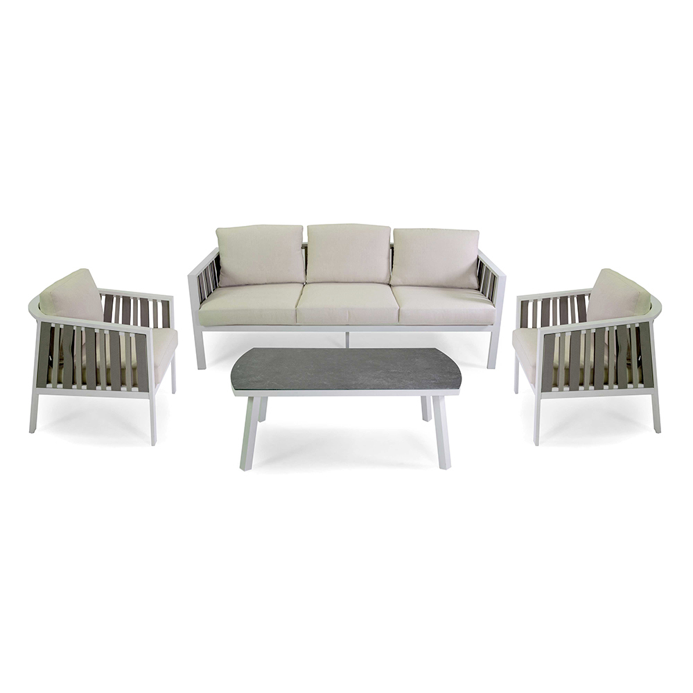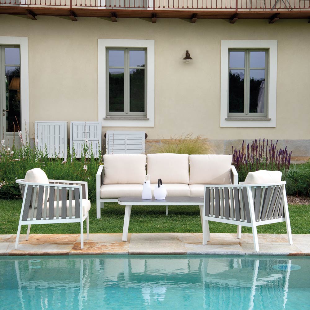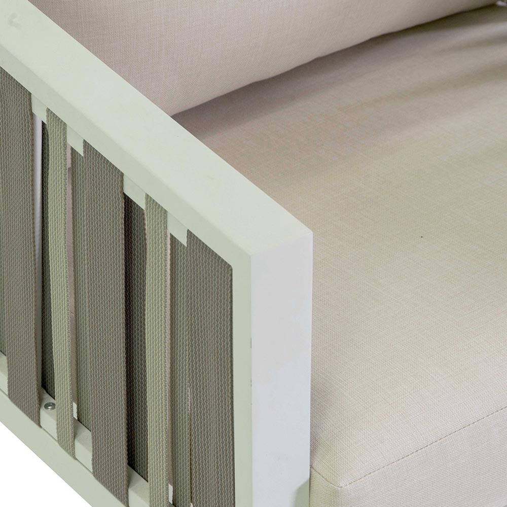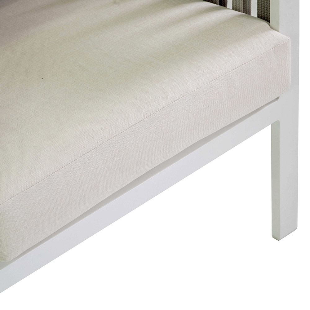 Linhas limpas e um design contemporâneo combinam com uma escolha de materiais de alta qualidade, oferecendo uma aparência elegante que eleva instantaneamente qualquer espaço ao ar livre. Os assentos são generosamente acolchoados com almofadas de tecido resistentes às intempéries, prometendo conforto incomparável e baixa manutenção.