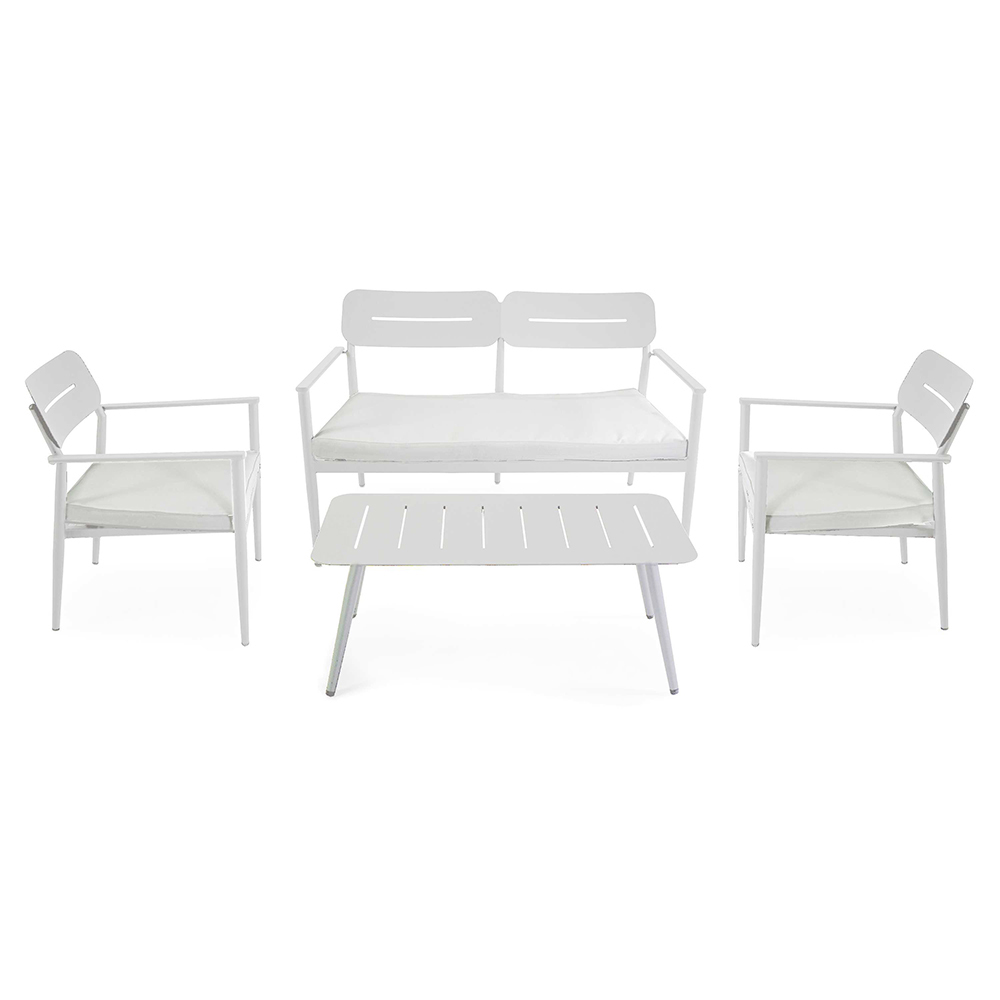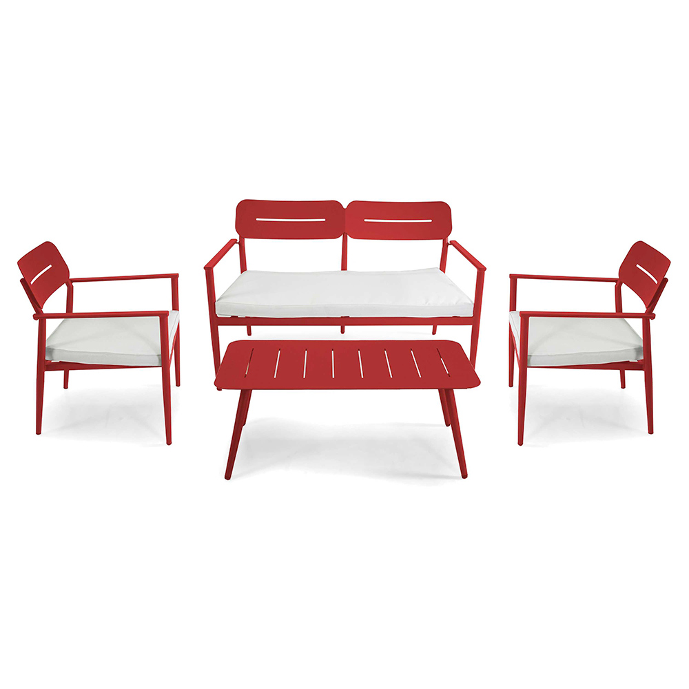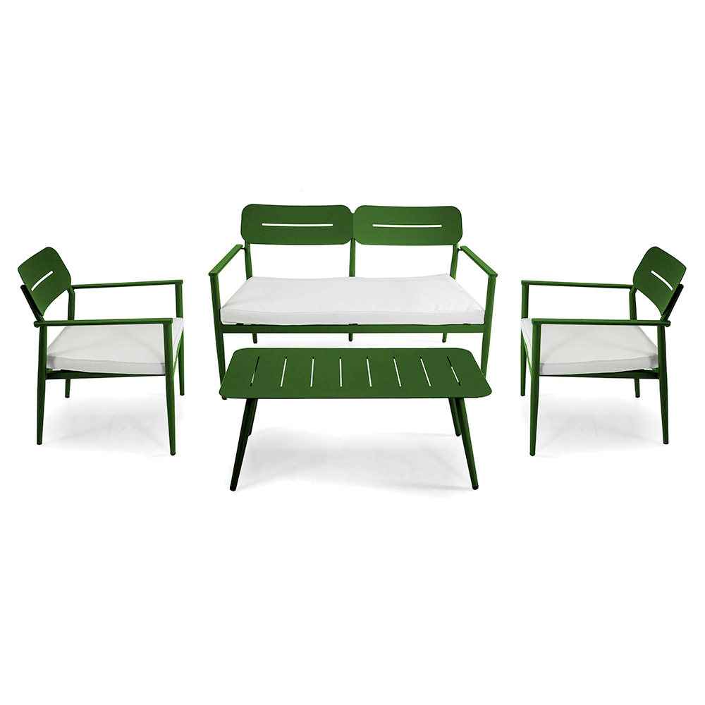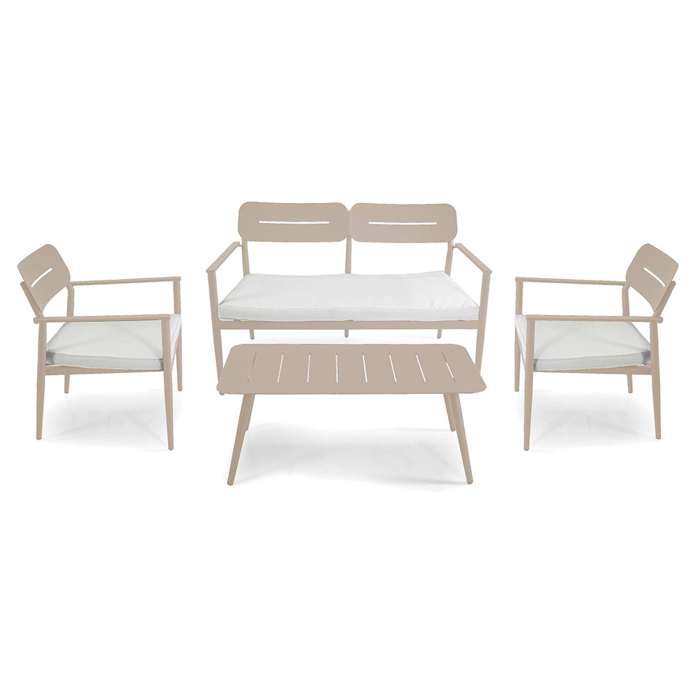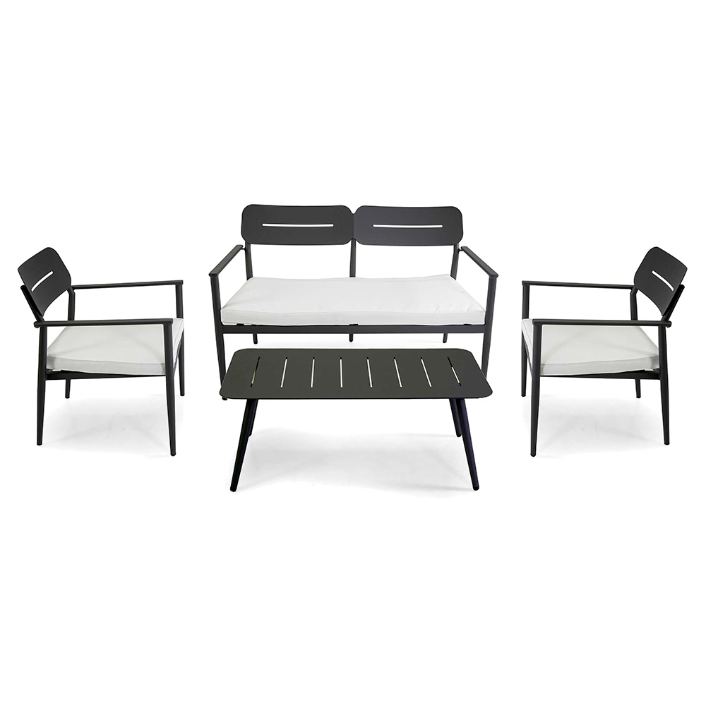 Este lounge ao ar livre combina funcionalidade e estilo moderno , perfeito para quem quer mobiliar espaços ao ar livre com bom gosto. A estrutura de alumínio é elegante e resistente, garantindo uma longa vida útil e fácil manutenção. Cada elemento do conjunto foi projetado para oferecer o máximo conforto, desde a poltrona com seu encosto ergonômico, até o espaçoso sofá com almofadas macias e convidativas.