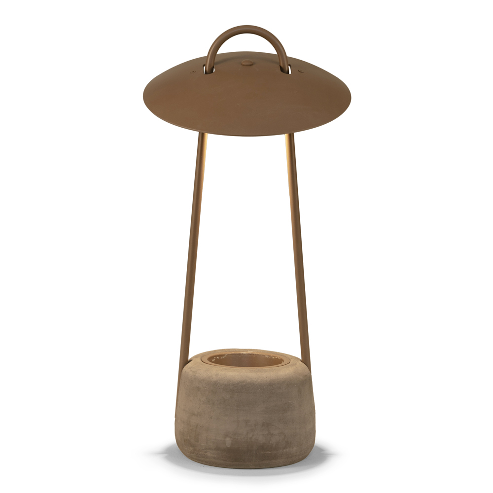 O design simples, porém refinado, com uma base de argila que funciona como um vaso, combina perfeitamente com a elegante estrutura metálica que sustenta um abajur minimalista. Essa combinação não só ilumina seu ambiente, mas também cria um canto verde, ideal para pequenas plantas ou ervas aromáticas.