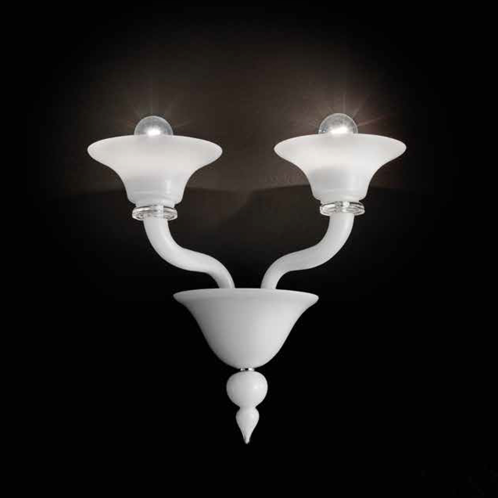 Luminária de parede de 2 luzes feita na Itália em vidro Veneza com acabamento branco leite - cristal artesanal com detalhes em metal com acabamento cromado polido . Um encontro inédito entre linhas históricas e design contemporâneo para dar vida a um móvel com charme e elegância atemporais. A sua estética caracteriza-se por um volume articulado que se torna dinâmico e leve através da vibração luminosa das maravilhosas superfícies de vidro soprado que alternam os elegantes braços transparentes com as taças confeccionadas com a técnica do casing . A sublinhar o seu valor é a atenção ao detalhe que transparece nos componentes metálicos cromados que permitem que o produto se adapte a diferentes gostos e situações de utilização.