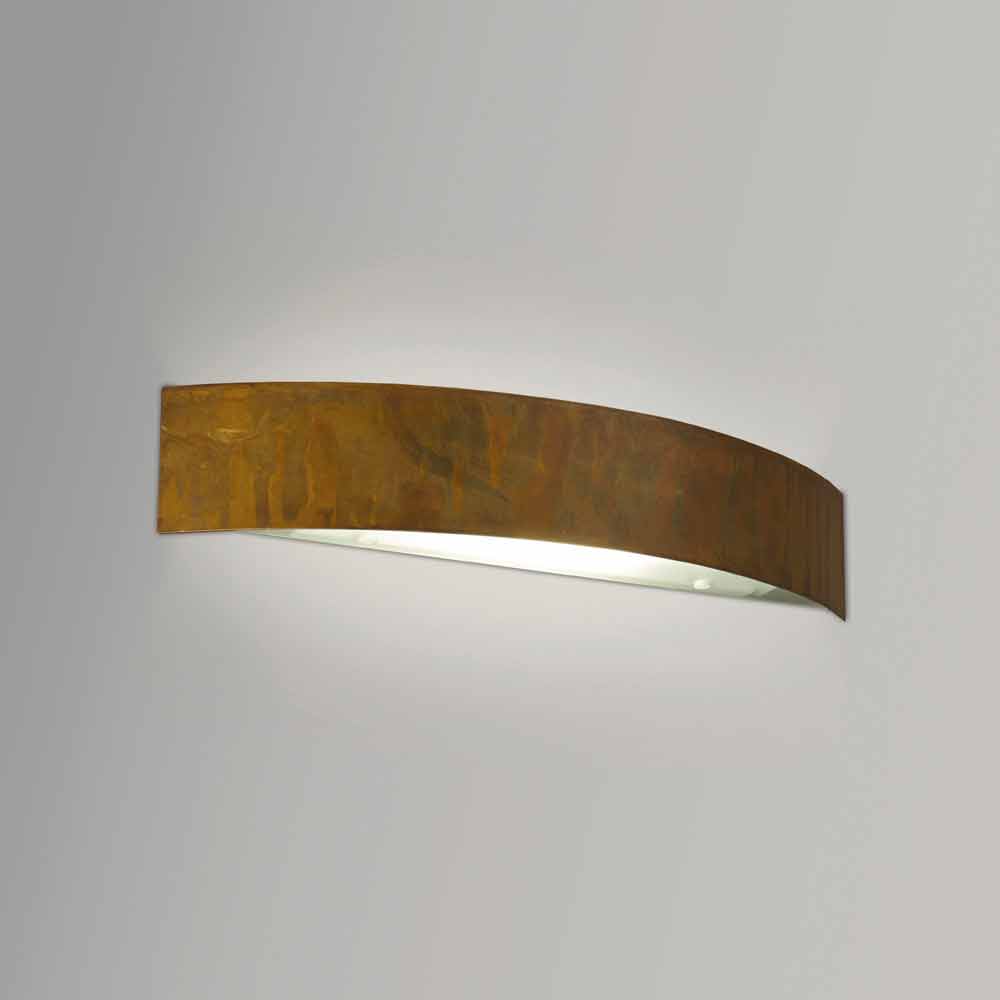 Lâmpada de parede com estrutura de latão oxidado. Disponível em dois tamanhos na forma redonda ou quadrada. Difusor de vidro temperado para emissão de luz direta e indireta.