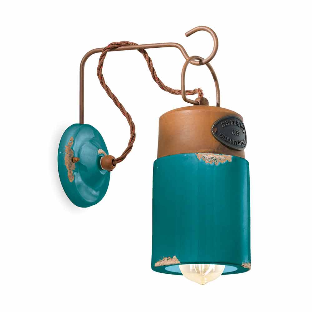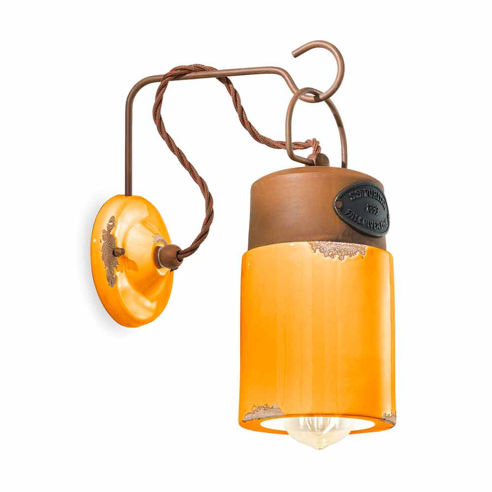 Este lindo candeeiro de parede é composto por uma estrutura em ferro com acabamento oxidado com um difusor em cerâmica brilhante, disponível em várias cores.
