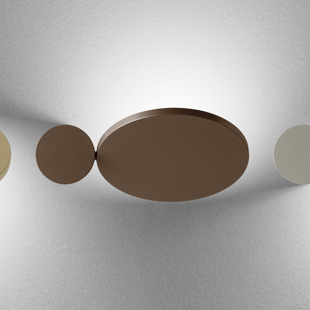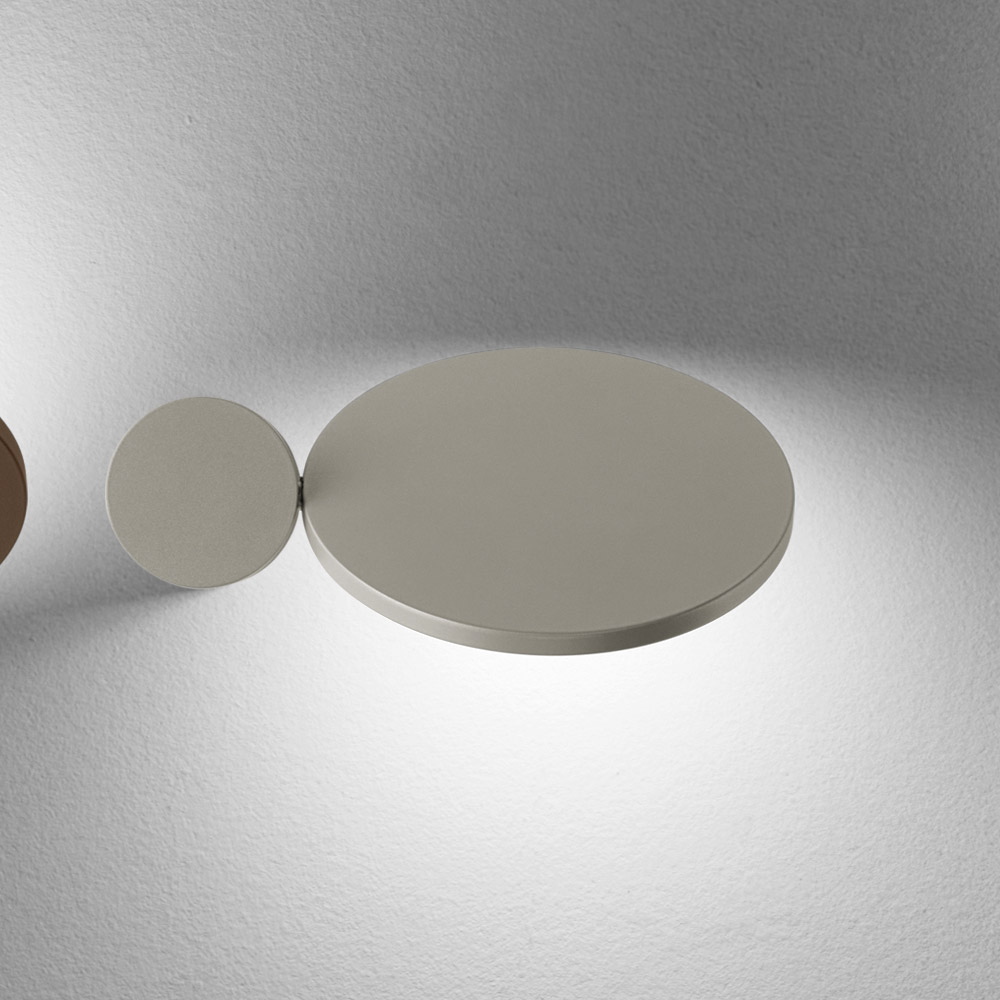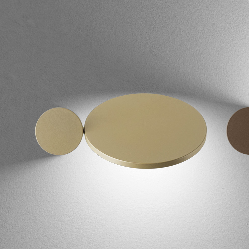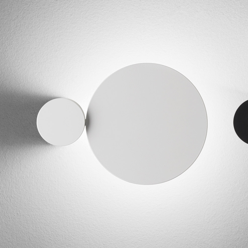 Esta arandela é uma verdadeira obra de arte luminosa , combinando design gráfico e função decorativa em um único gesto. Composta por formas geométricas essenciais , ela brinca com discos e ovais sobrepostos que, quando acesos, criam um efeito de iluminação suave e dramático na parede.