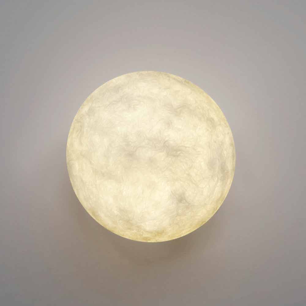 Feito por In-es.artdesign para a coleção Luna em Nebulite®, um material inovador feito de resina e fibra que dá à lâmpada graças às suas veias, o dom de reproduzir uma atmosfera lunar mágica.