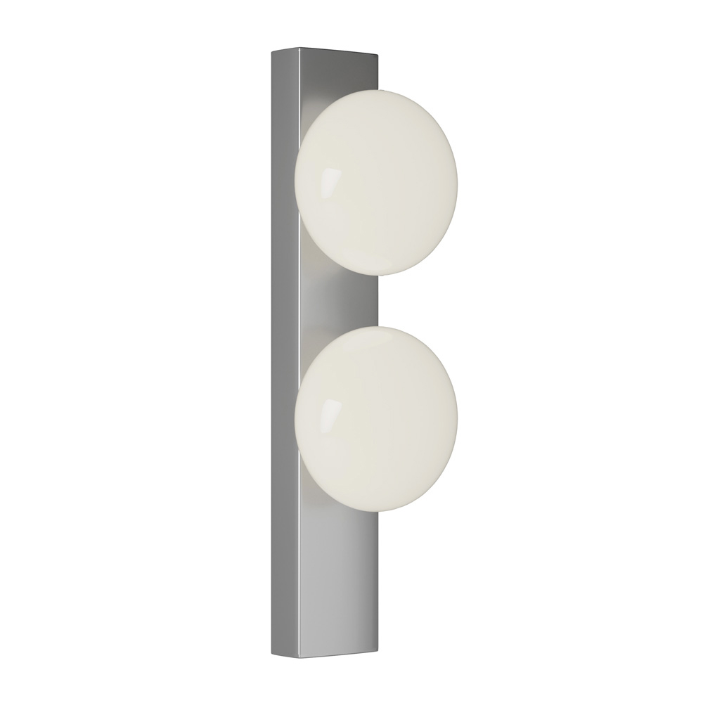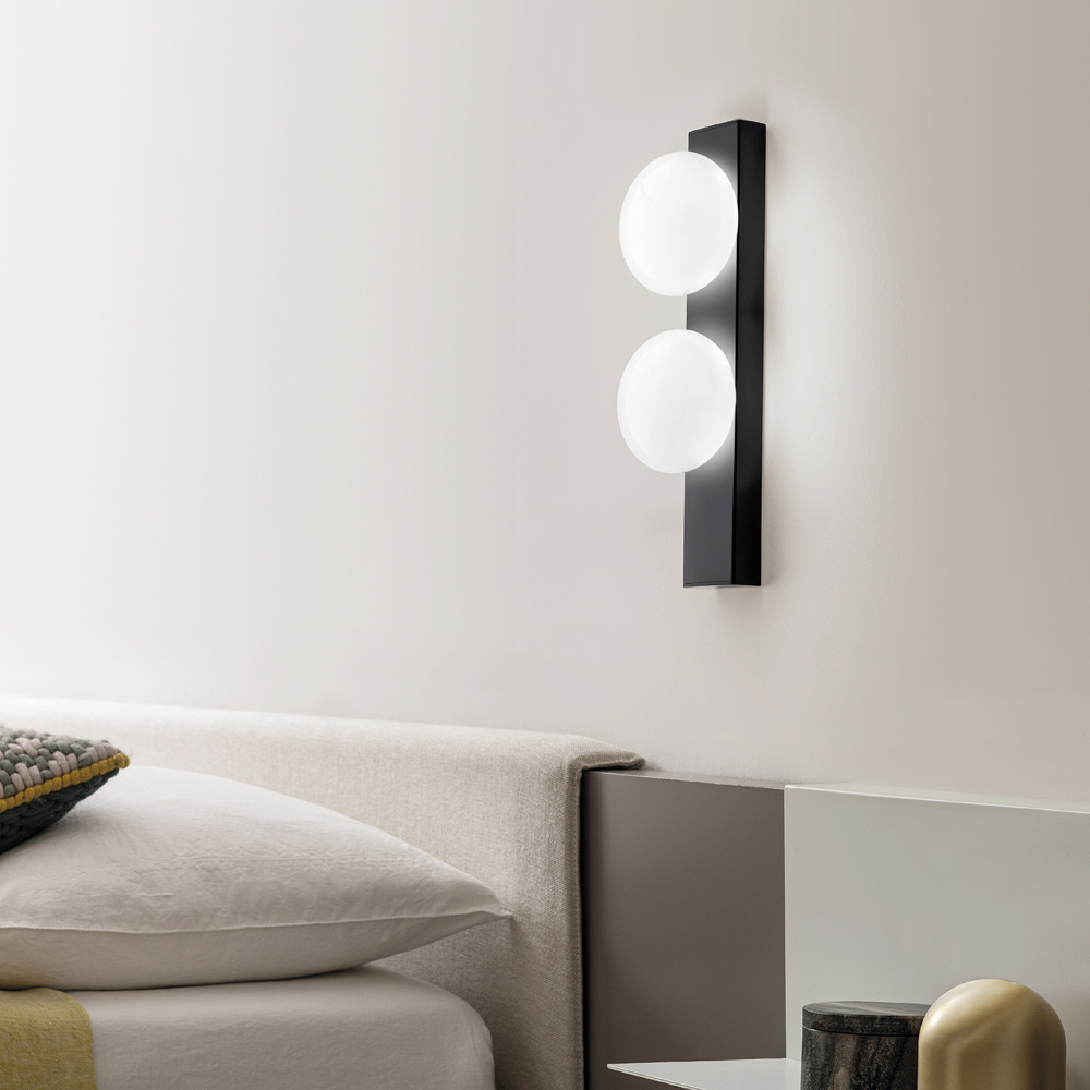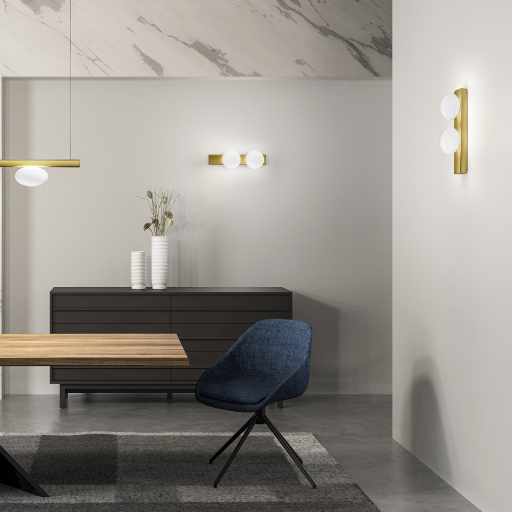 Esta luminária de parede é a combinação perfeita de design geométrico e minimalismo refinado . A composição essencial é realçada por uma ou duas esferas luminosas de vidro opalino , que difundem uma luz suave e acolhedora , ideal para criar ambientes relaxantes e sofisticados.