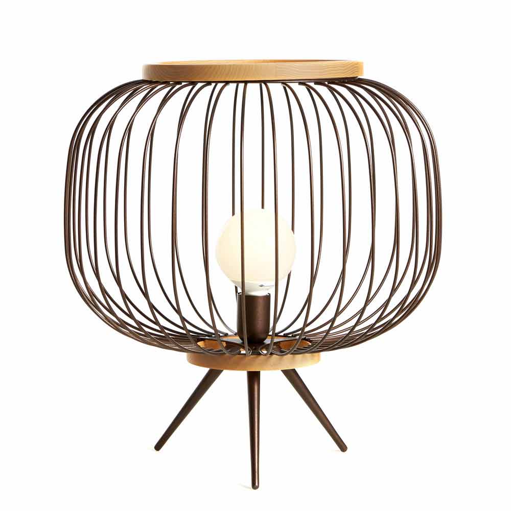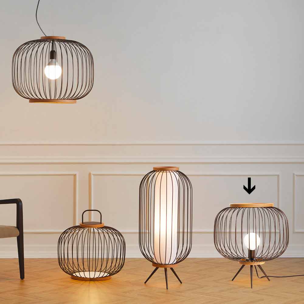 Candeeiro de pé em barra de aço moldada e pintado com pós epoxi. As duas bandas que fecham o corpo arredondado são feitas de madeira natural. As versões de chão também podem ser usadas como bolsos vazios tanto na versão de abajur como sem. A fonte LED da versão com pega está equipada com uma bateria recarregável com autonomia de cerca de 6 horas.