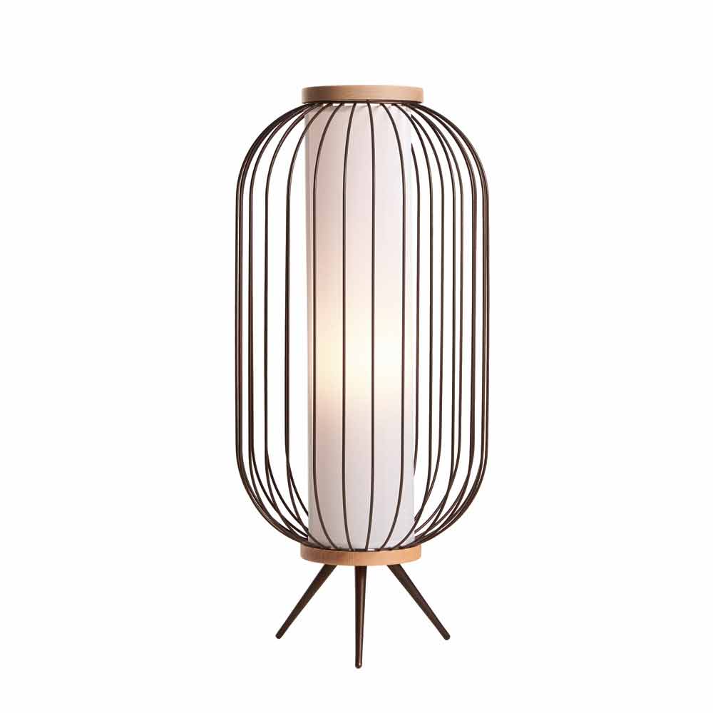 Candeeiro de pé em barra de aço moldada e pintado com pós epoxi. As duas bandas que fecham o corpo arredondado são feitas de madeira natural. As versões de chão também podem ser usadas como bolsos vazios tanto na versão de abajur como sem. A fonte LED da versão com pega está equipada com uma bateria recarregável com autonomia de cerca de 6 horas.