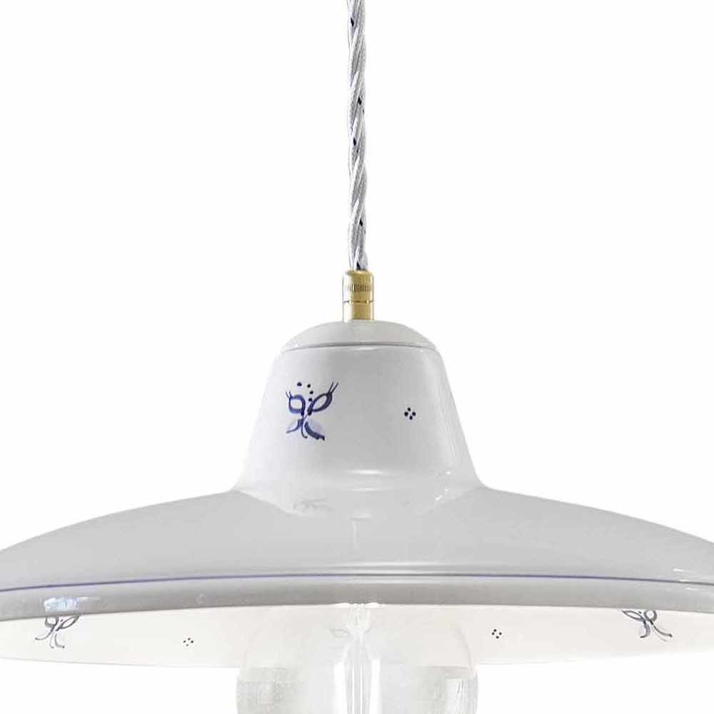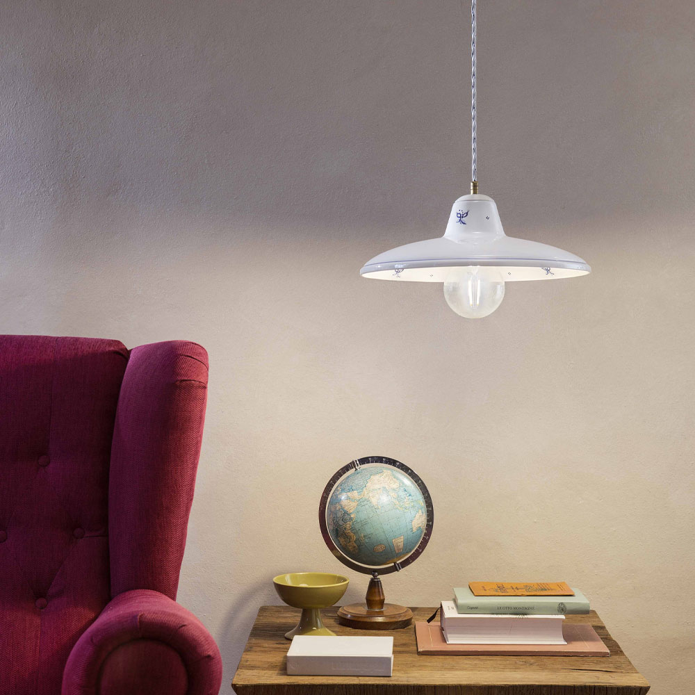 Luminária suspensa de ferro e cerâmica decorada à mão, fabricada na Itália pela Ferroluce.