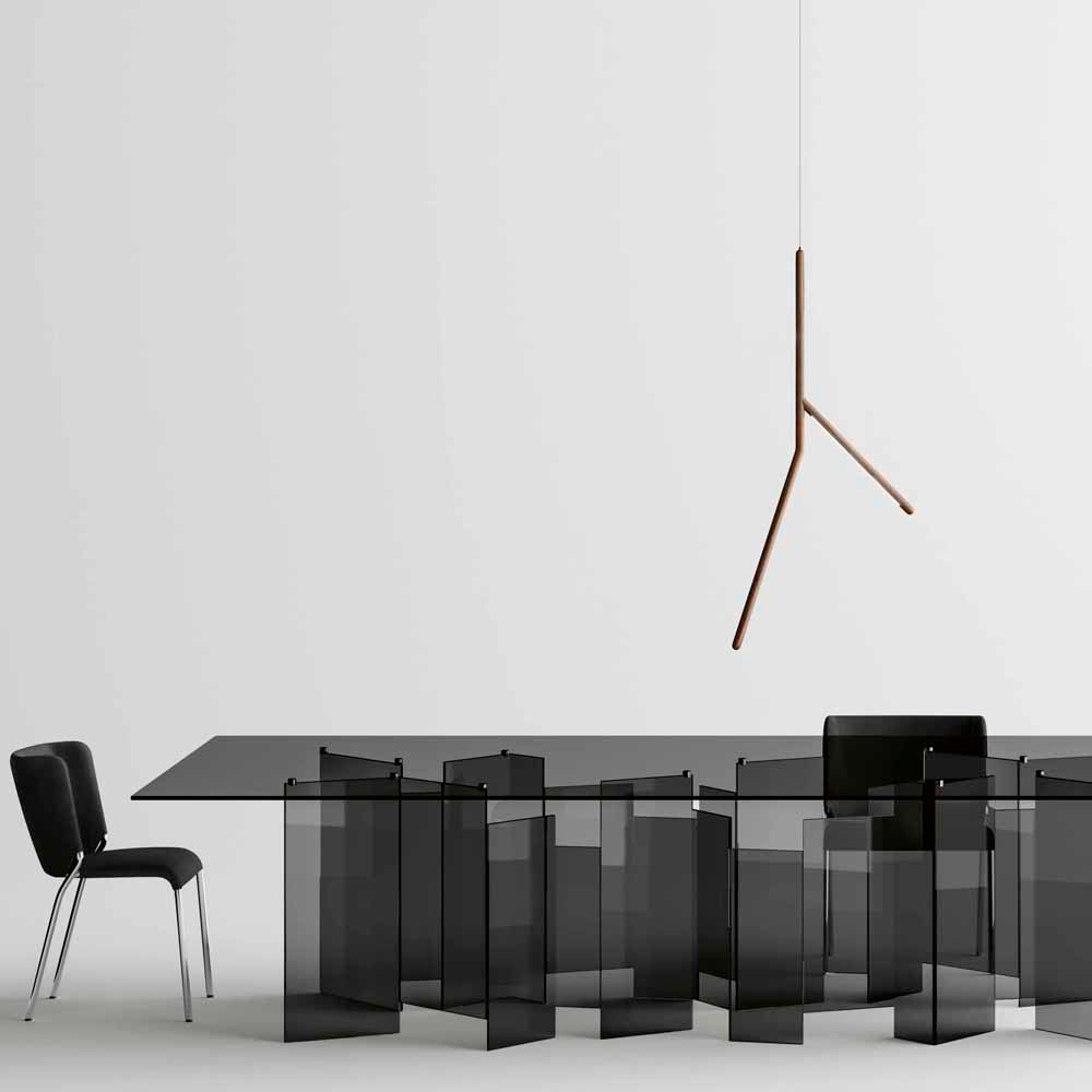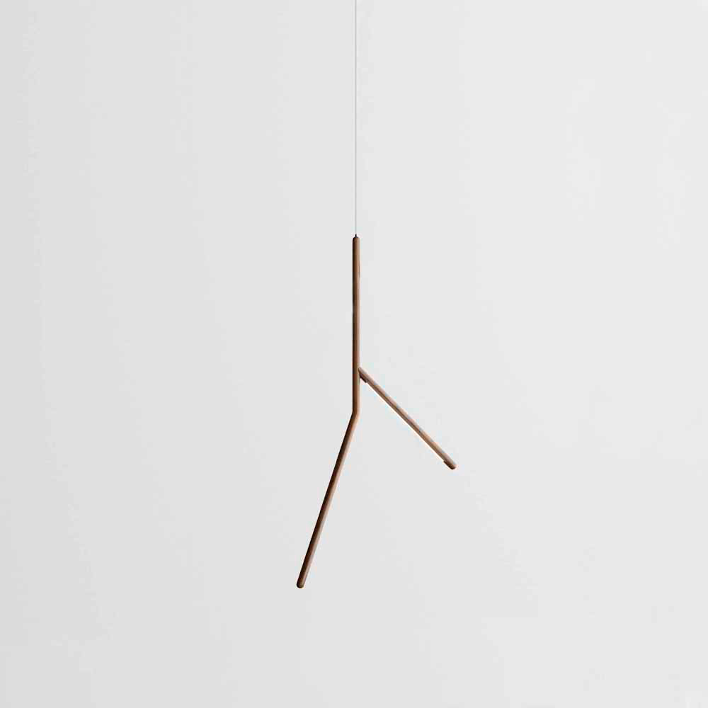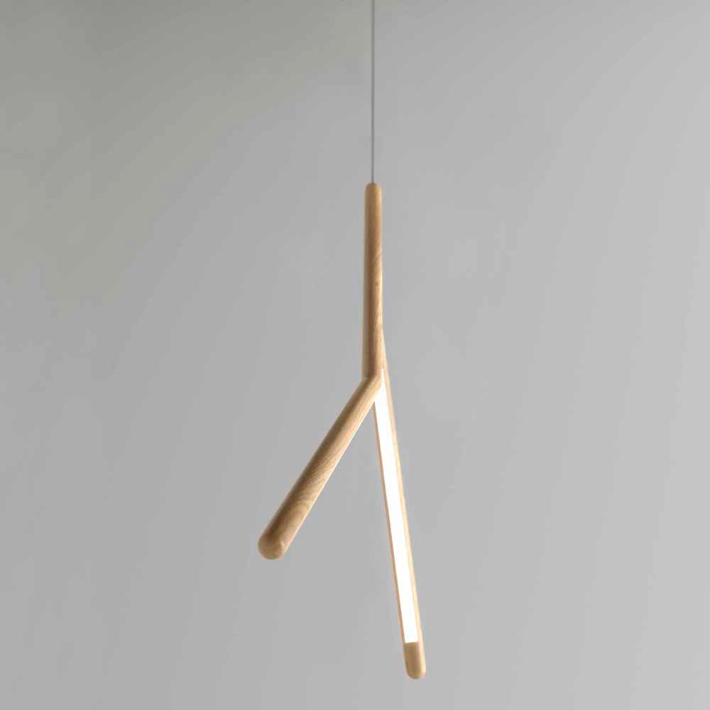 Este candeeiro combina o artesanato da madeira maciça com a tecnologia de iluminação. O delicado signo gráfico ganha destaque nas instalações com múltiplas luminárias, tornando-se o protagonista absoluto do ambiente.