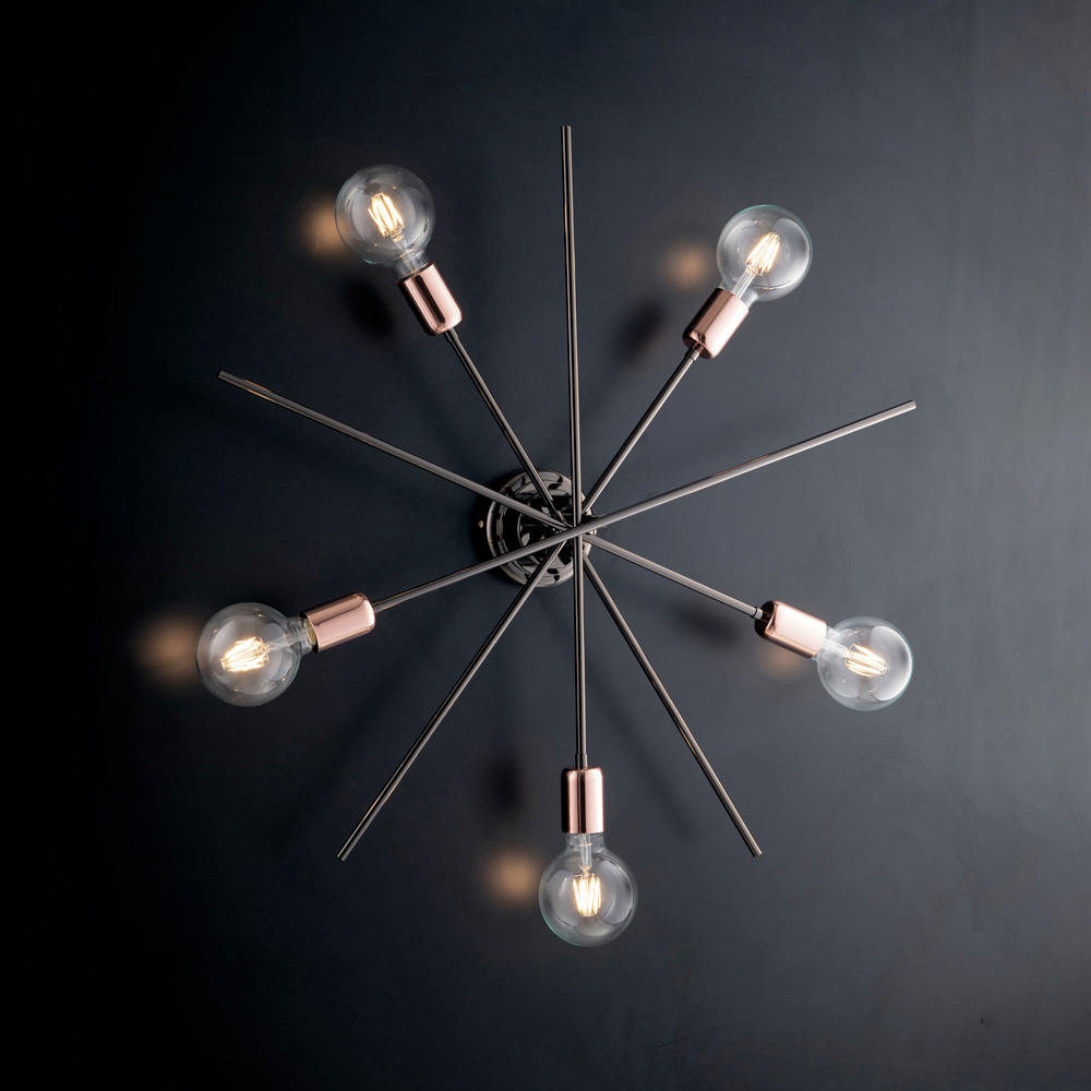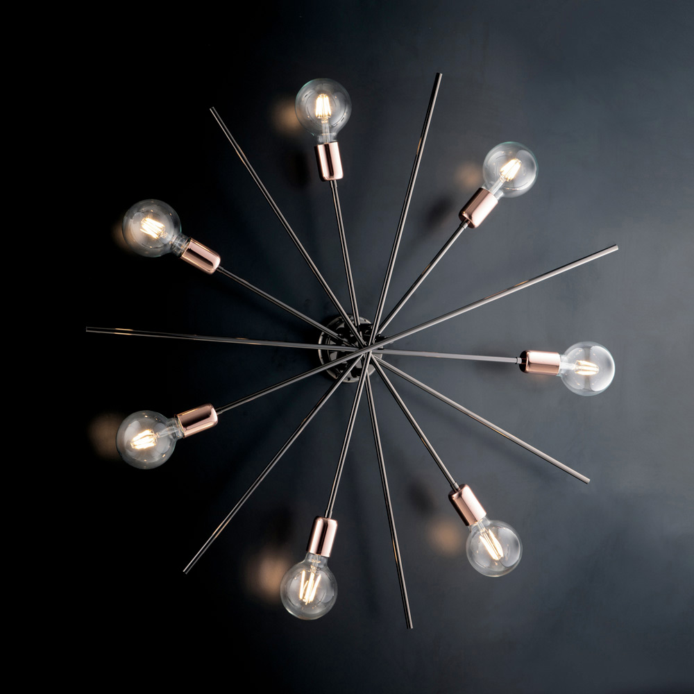 Icônica e visualmente impactante, esta luminária de teto artesanal em ferro cromado preto e cobre é uma criação moderna e sofisticada. A estrutura radial, inspirada no estilo industrial contemporâneo e de meados do século XX , desdobra-se em uma composição dinâmica de braços metálicos que difundem a luz de maneira uniforme e dramática.