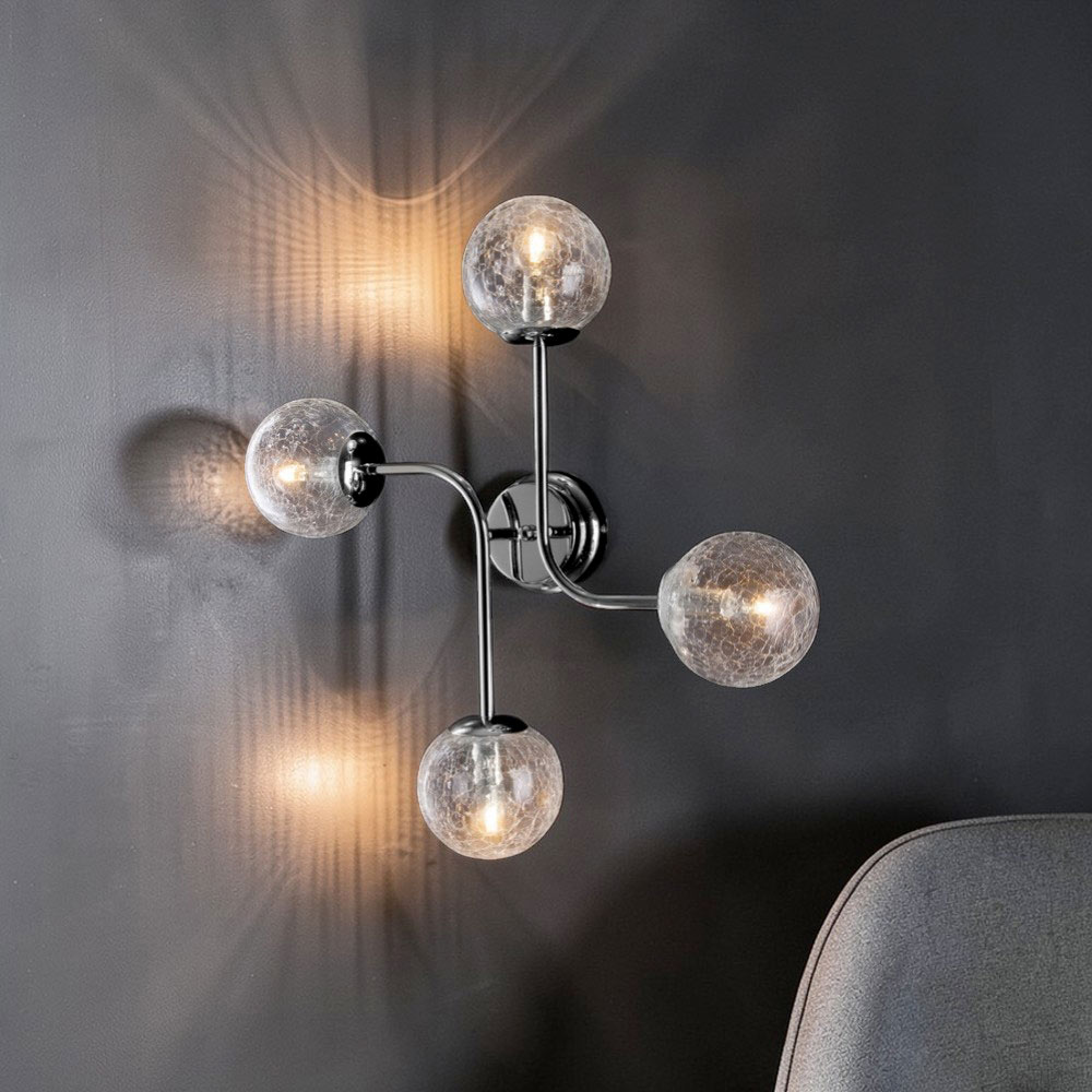 Simples, moderna e visualmente impactante, esta luminária de teto de design em ferro cromado polido é uma solução de iluminação contemporânea projetada para valorizar espaços com elegância discreta. A estrutura compacta, com braços balanceados e difusores esféricos, cria uma interação refinada de volumes e reflexos que confere profundidade ao ambiente.