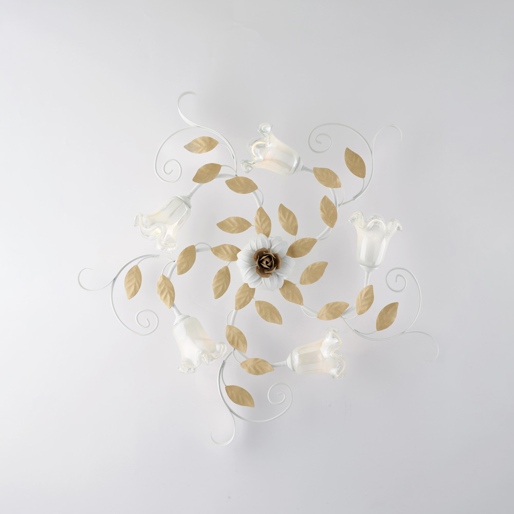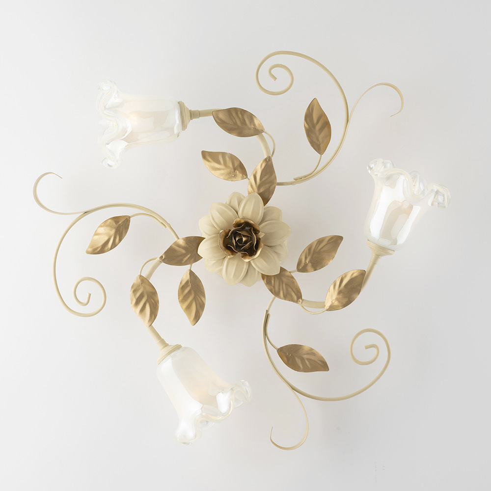Refinada e decorativa, esta luminária de teto clássica, feita à mão em ferro laqueado cor marfim, é uma criação luminosa com forte caráter romântico. A estrutura floral, adornada com curvas sinuosas, folhas decorativas e difusores de vidro em formato de flor , confere ao teto uma leveza e elegância harmoniosa, transformando a luminária em um verdadeiro elemento decorativo.