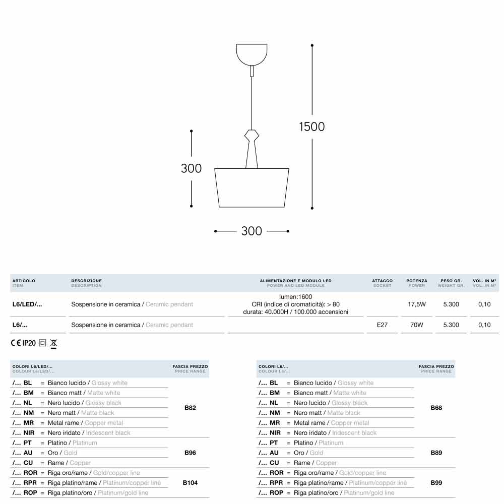 I Lustri 6 está disponível em diferentes acabamentos e com soquete de lâmpada padrão E27 ou luz LED.